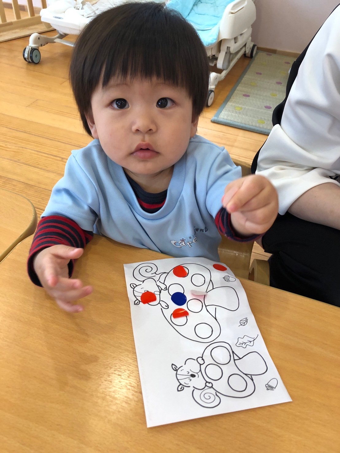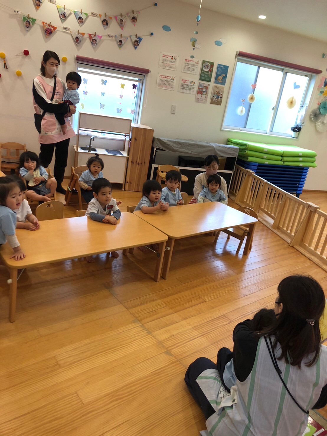 朝の会の名前呼びでは名前を呼ばれたら0歳児さんは可愛い顔を見せてくれ🥰1歳児さんは「はーい!」と手を挙げくれます💕2歳児さんは「元気です✊」と教えてくれました👏