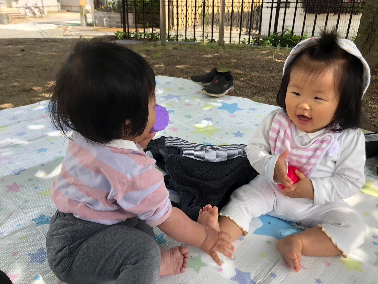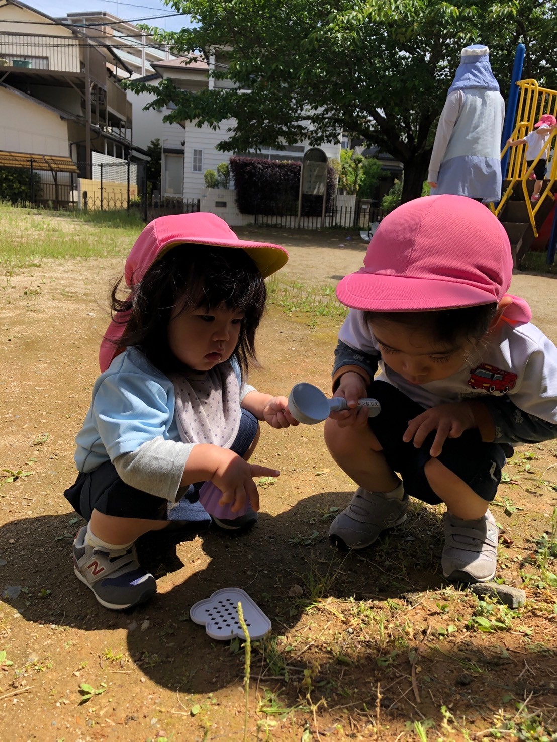 今日もかわいい頭を寄せ合って、ダンゴムシやアリを見つけて大盛りでしたよ❣️