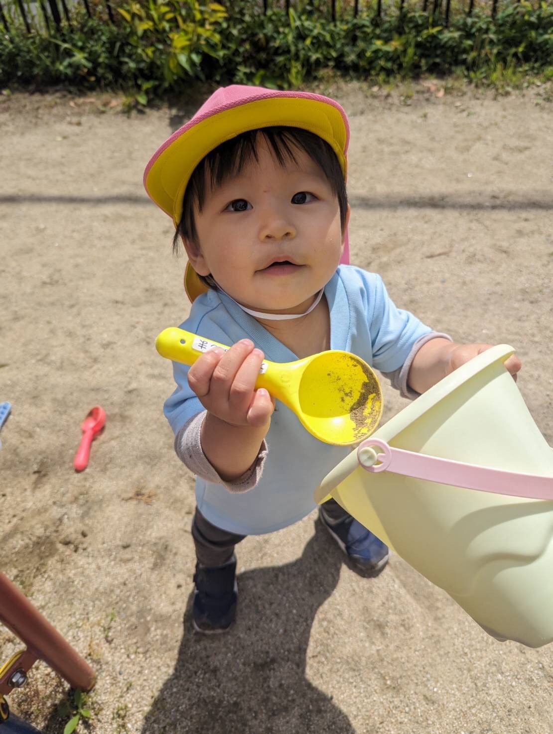 ひよこ・りす組さんも公園での合同範囲が広がってきて、バケツとスコップを持って散策したり、滑り台を滑って遊んだり、活発に過ごしていました。