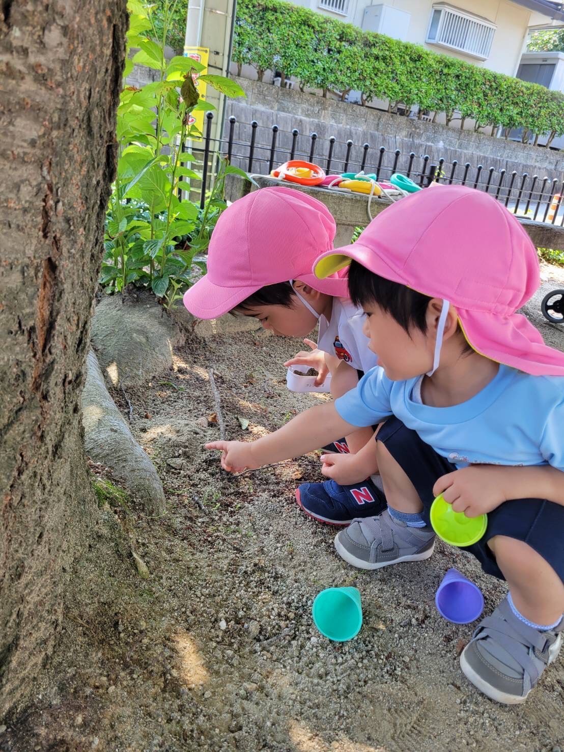 アリ探しをしたり、砂遊びをしたり暑い中でも外遊びを楽しみましたよ❤️