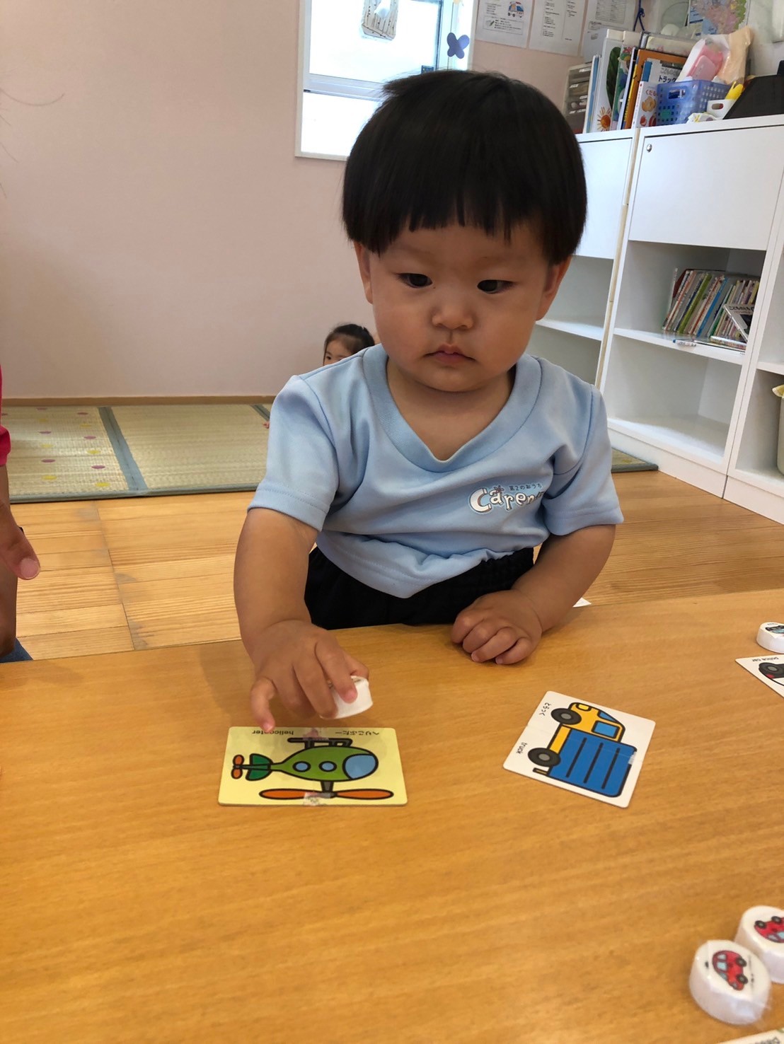名前を上手に言えたぱんだ組さん。JUMPしてWALKしてSTOP!乗り物のくじを引いて、同じカードの所に置きにいきました👏✨りすさんも上手に出来ました❤️最後は頑張ったねシールを6月のところに貼って先生とお別れの歌を歌いました♪