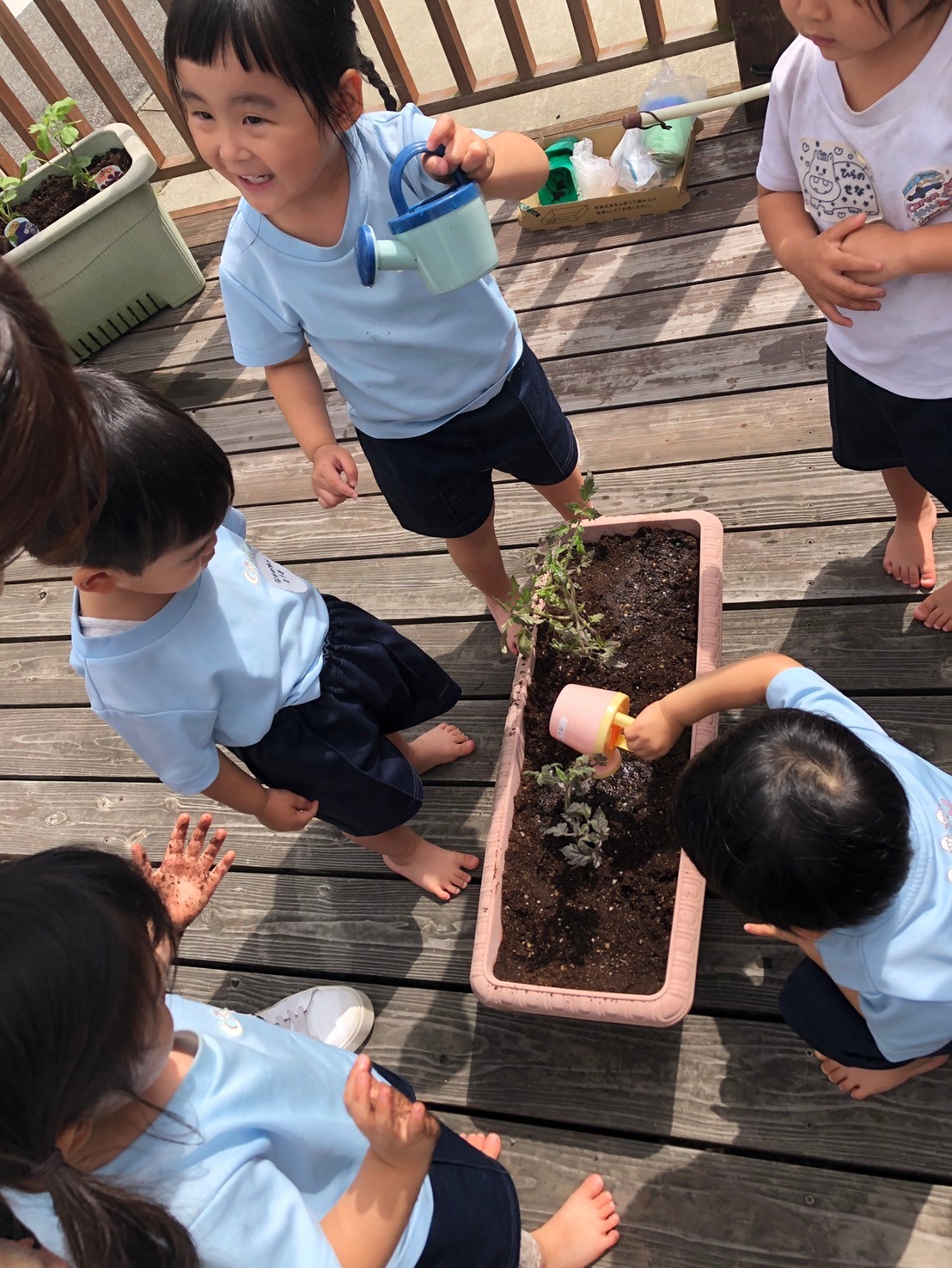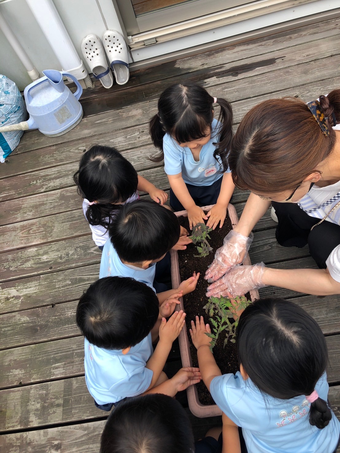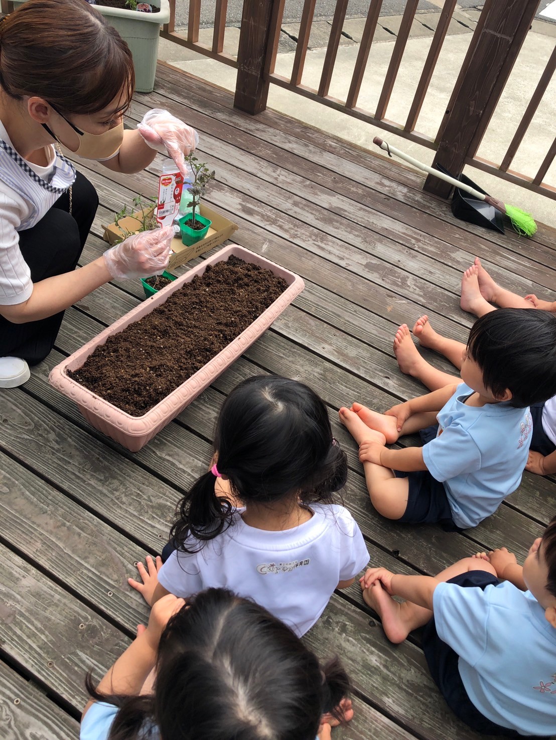 朝の会の後は、ぱんだ組さんでミニトマトの苗植えをしました。
