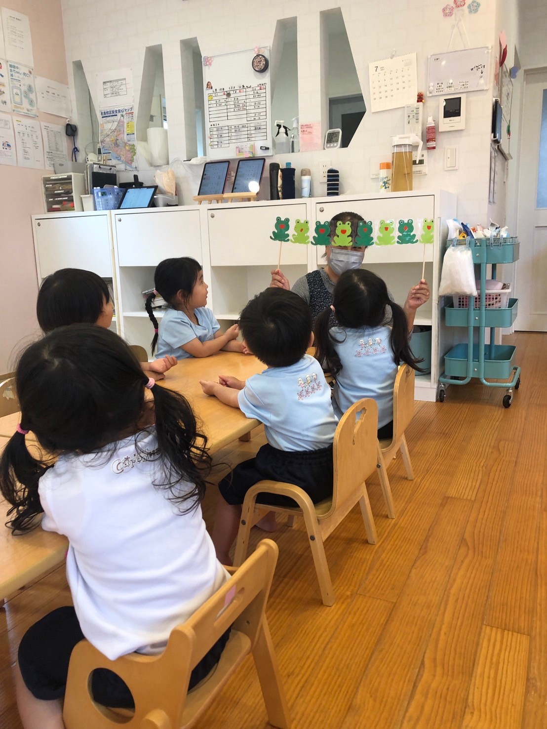 「かえるのうた♪」に合わせて、連なって登場するかわいいカエルに大喜びな子ども達でした♡