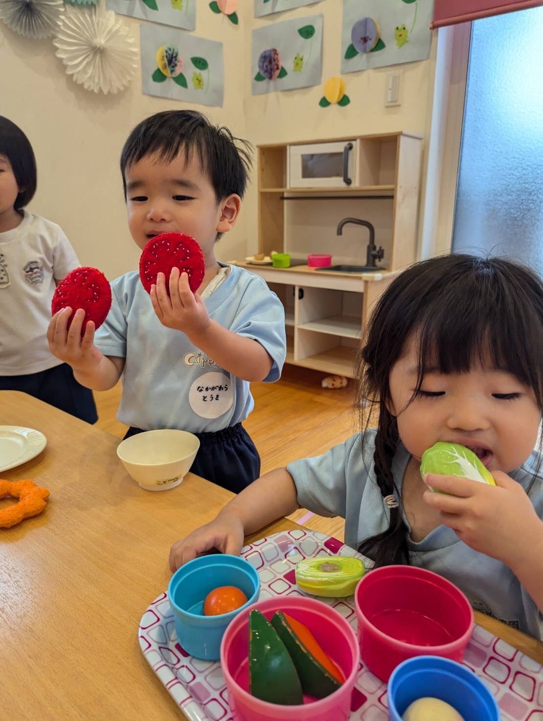 お野菜やドーナツを食べる真似っこをして、楽しそうに遊んでいましたよ🤗【名島園の今日の給食です】