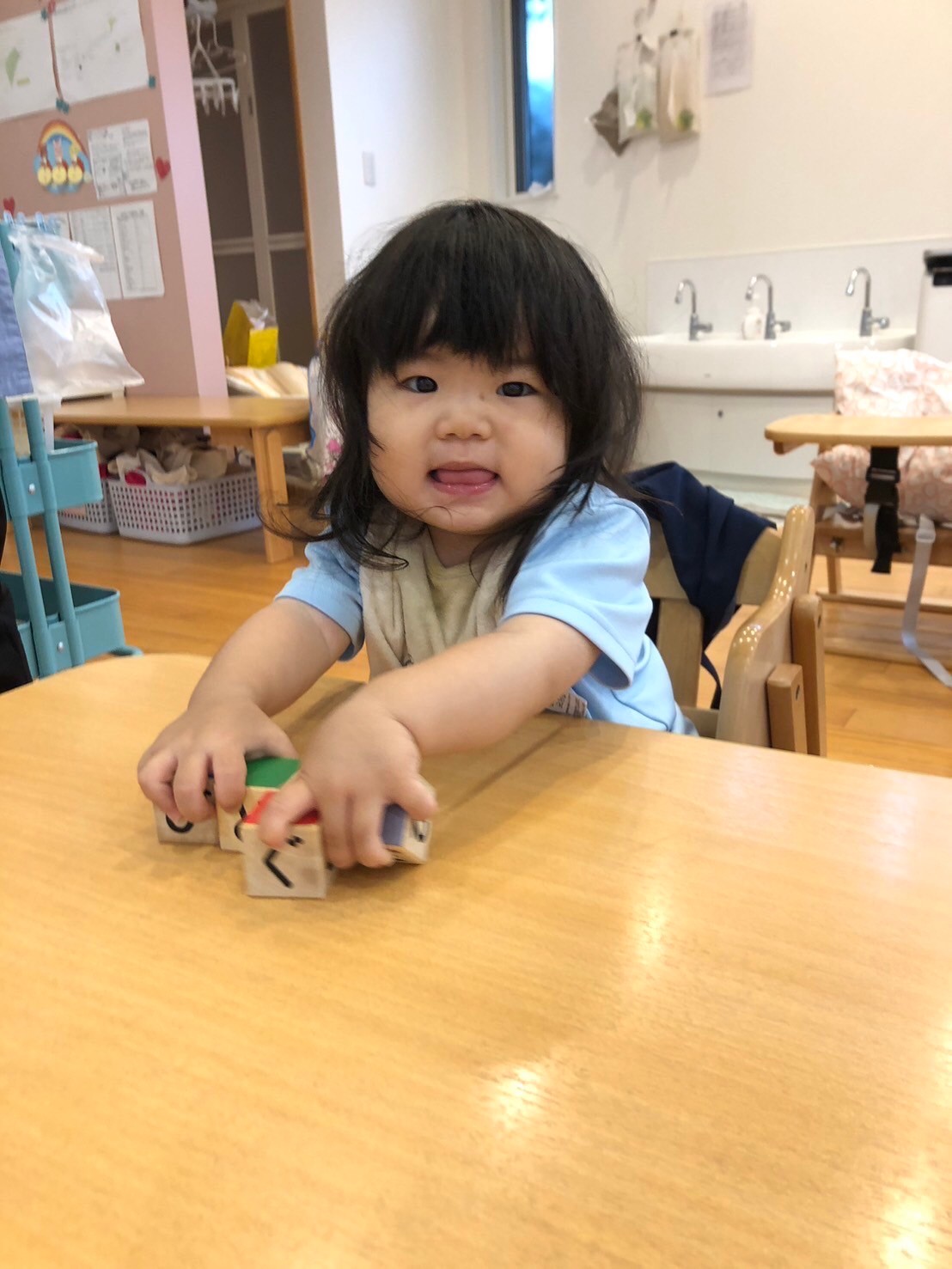 上手に数個、積み木を積み上げることが出来て、嬉しそうな表情を見せていましたよ。