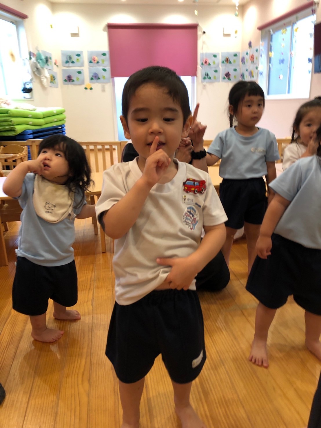「しーしーしー🤫」と口元に手を当てて静かにするところの表現がとてもかわいい子ども達でした♡レッスンのあとは、ひよこ・りす組はパズルや積み木で遊びました。