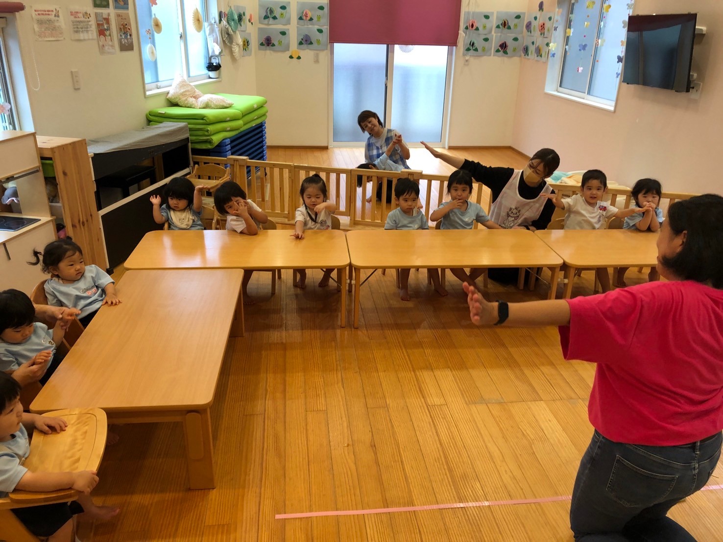 「the wheels on the bus」の歌ではチャリナ先生を先頭に歌を歌いながら、クラクションを鳴らしたり、手でワイパーを表現したりしながら運転をしました。
