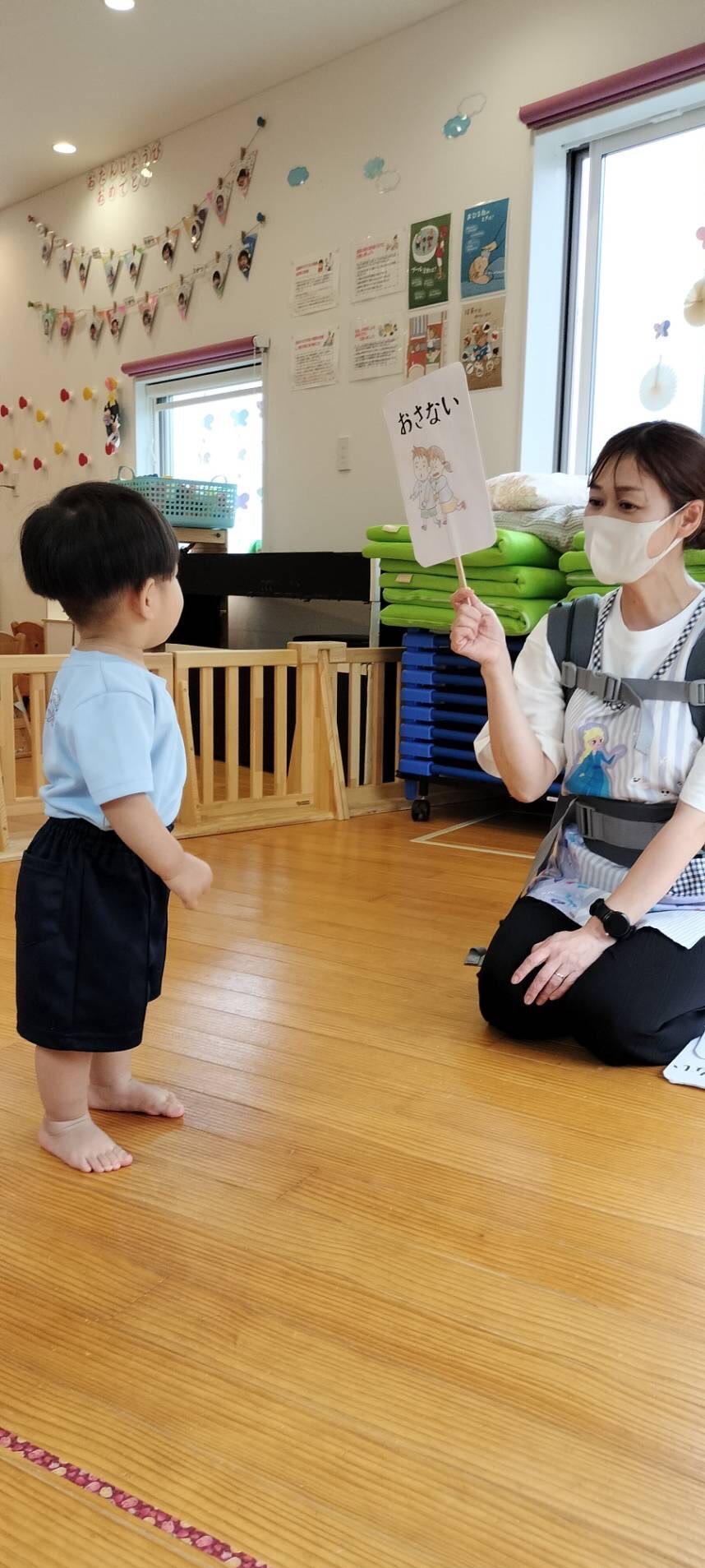 避難の際のお約束のペープサートでは、「おさない、はしらない、しゃべらない、もどらない」としっかり覚えていて、積極的に答えることが出来ていたぱんだ組さんです😊