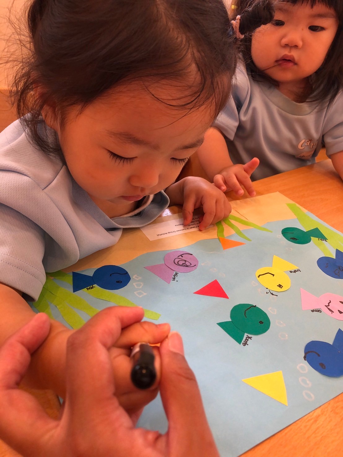チャリナ先生が持ってきてくれた製作で水槽に魚を貼り付けてお顔を書いたり、「バブル!」と言いながら泡を描きました🐟