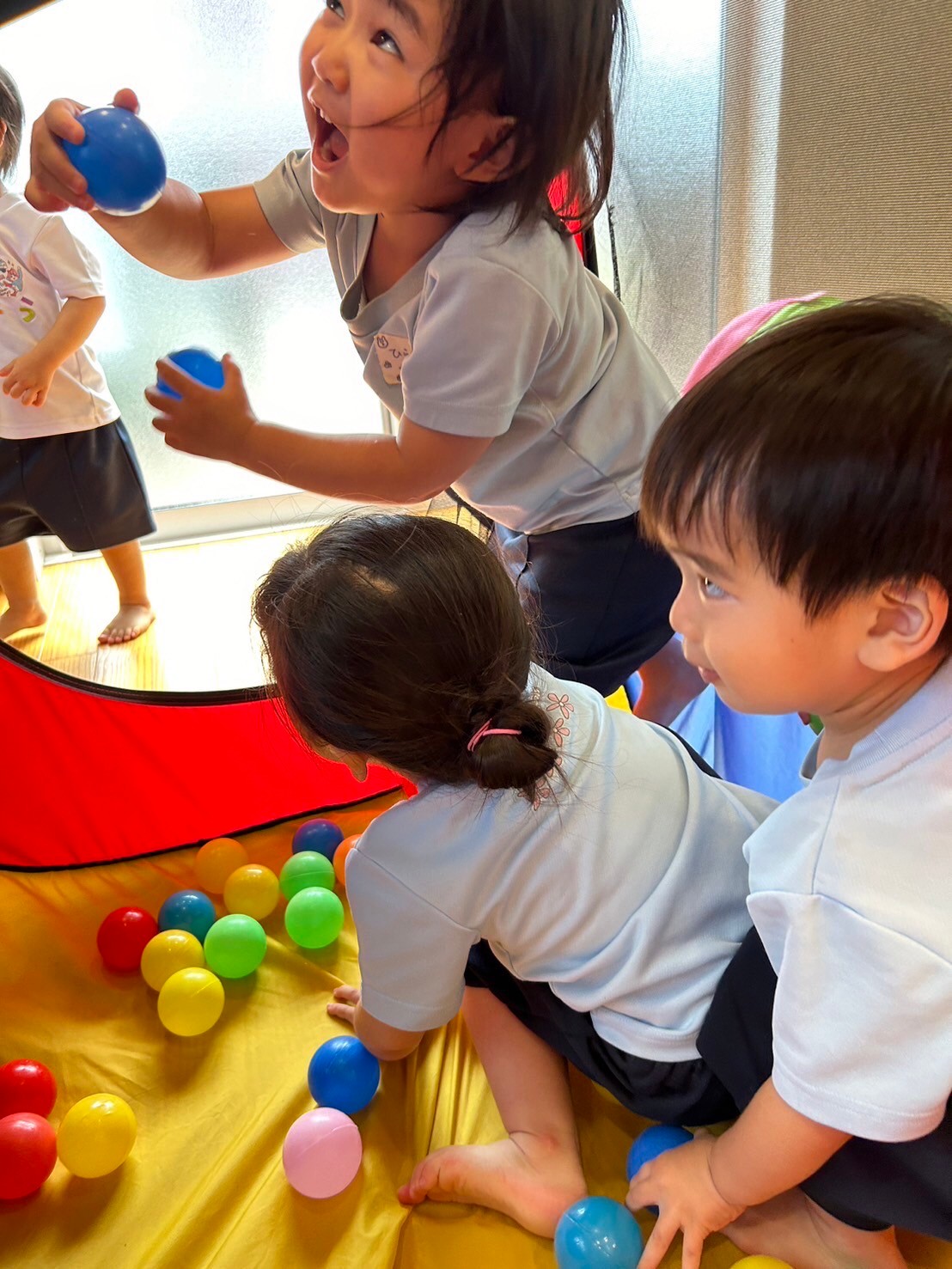 ボールを投げたり、集めたり、色んな色のボールに大喜び😍順番を守って、トンネルも潜りました❗️
