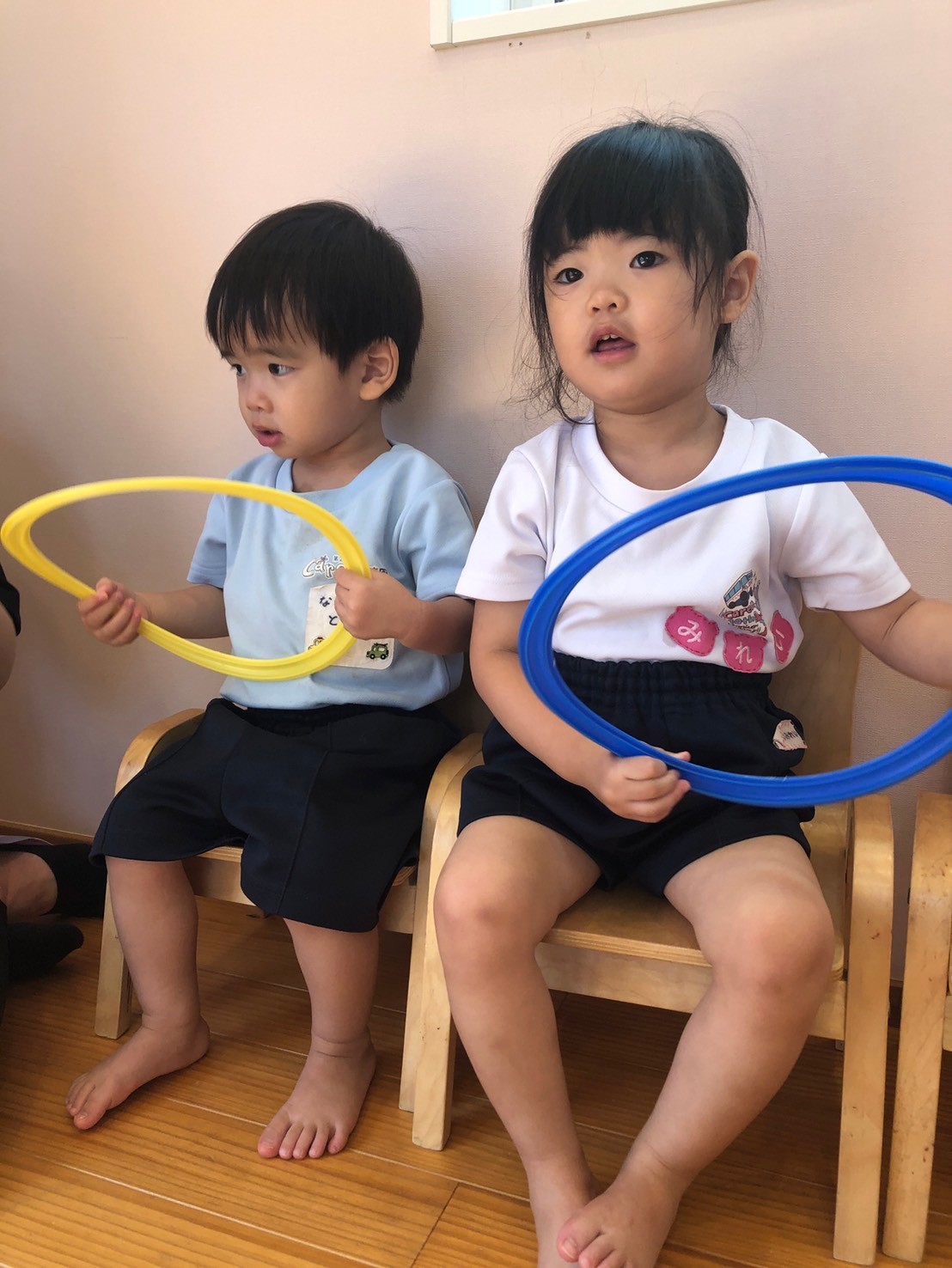 最後にフープを使って、大きなたいこ小さなたいこや、バスごっこを歌いました🤗元気いっぱい歌って、踊って、ニコニコ笑顔の子どもたちでした❣️