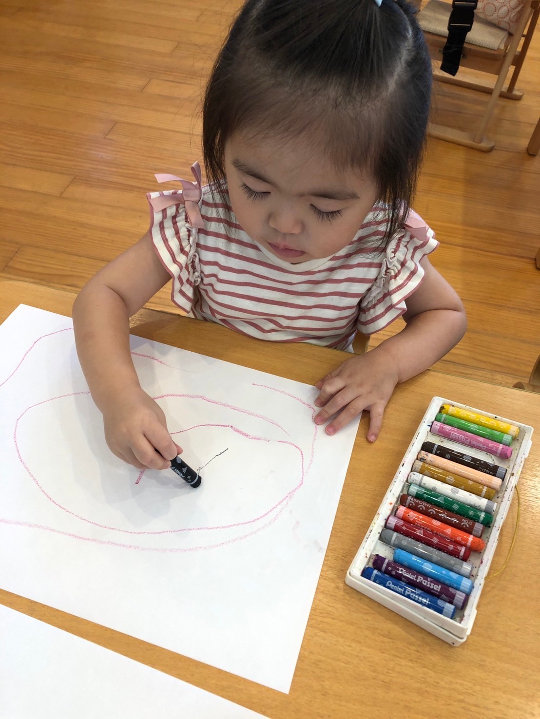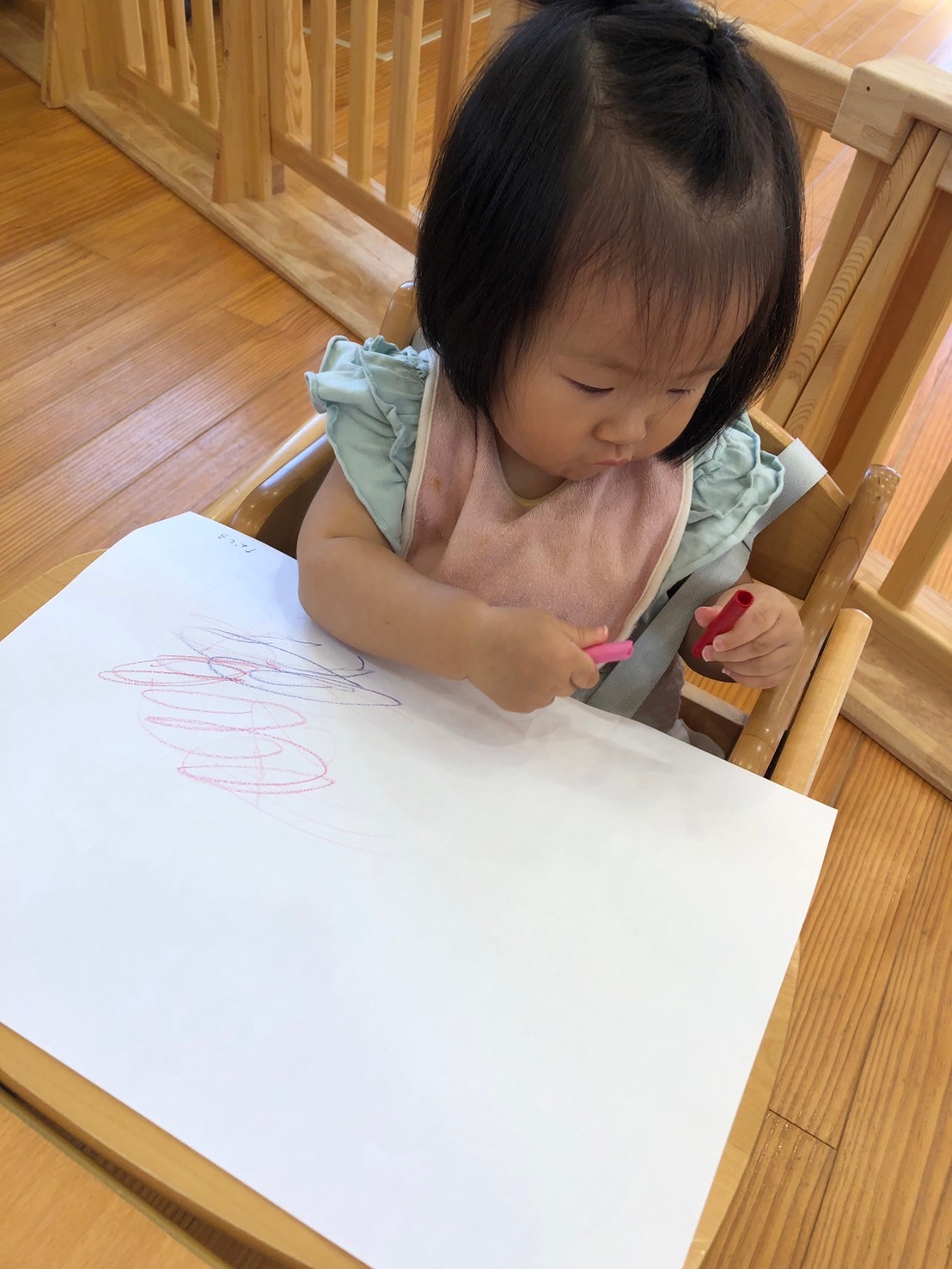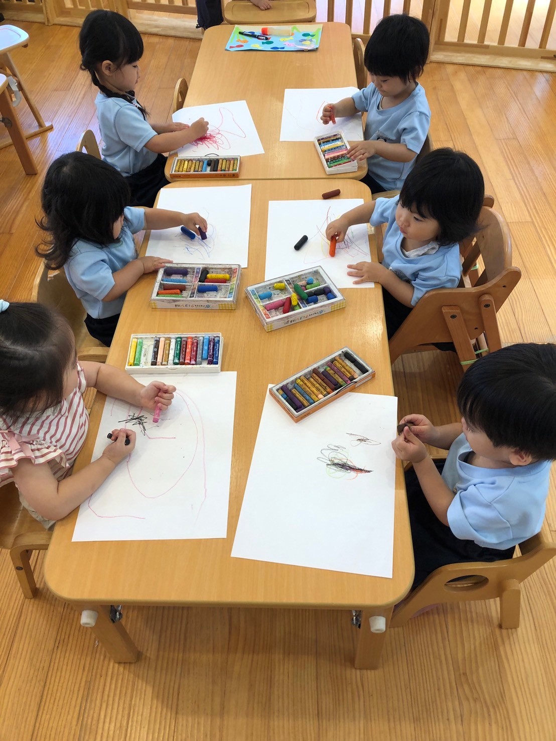 滑り台を滑ったりしながら、水しぶきをあげてダイナミックに楽しんでいましたよ💦お絵描きをしたお友だちは、好きな色のクレパスを握ってのびのびと描いて楽しみました🖍