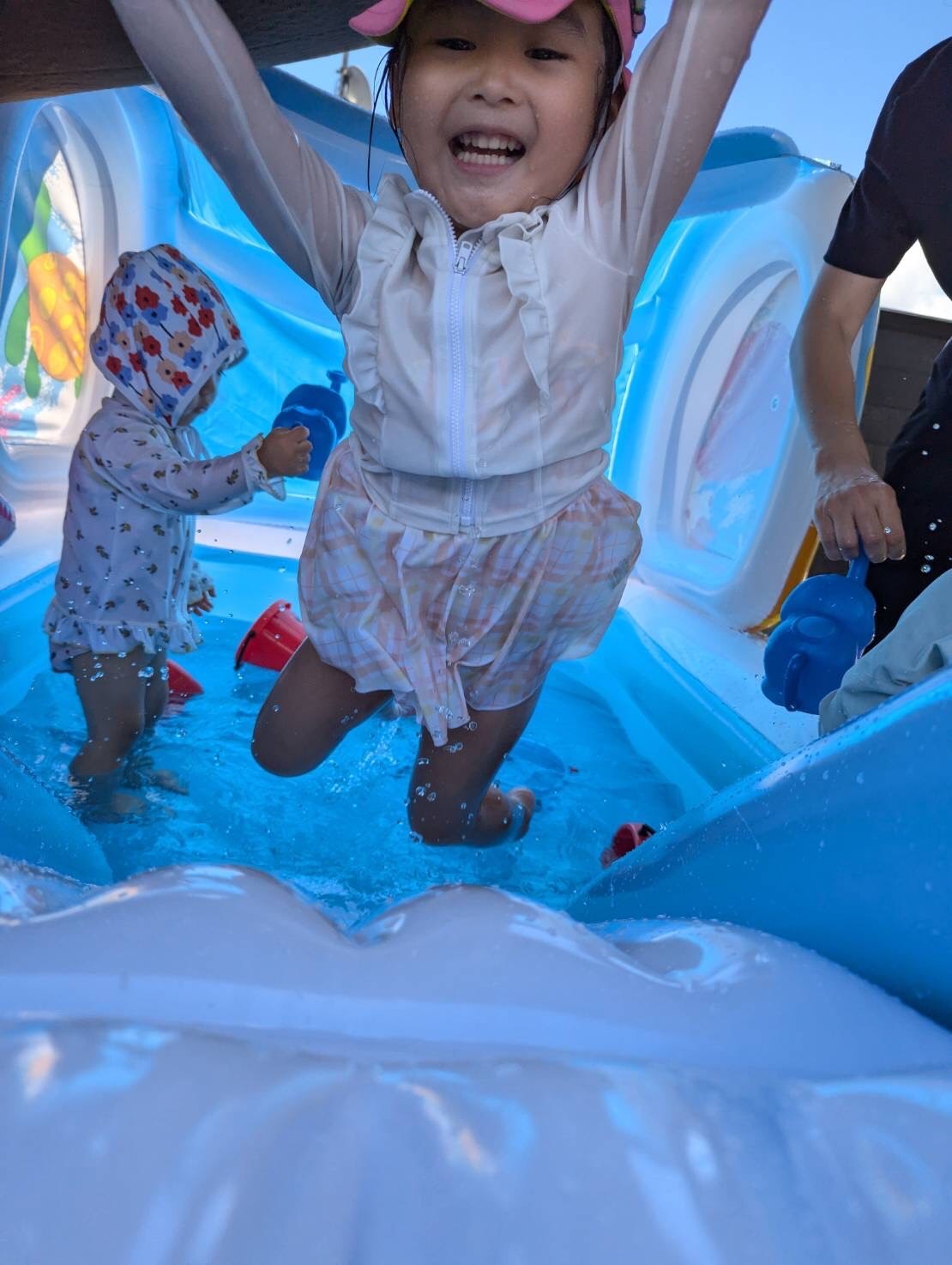ひよこ組のお友だちもすっかり水に慣れて、プールにつかまり立ちをして、ニコニコと水に触れて遊んでいます😆