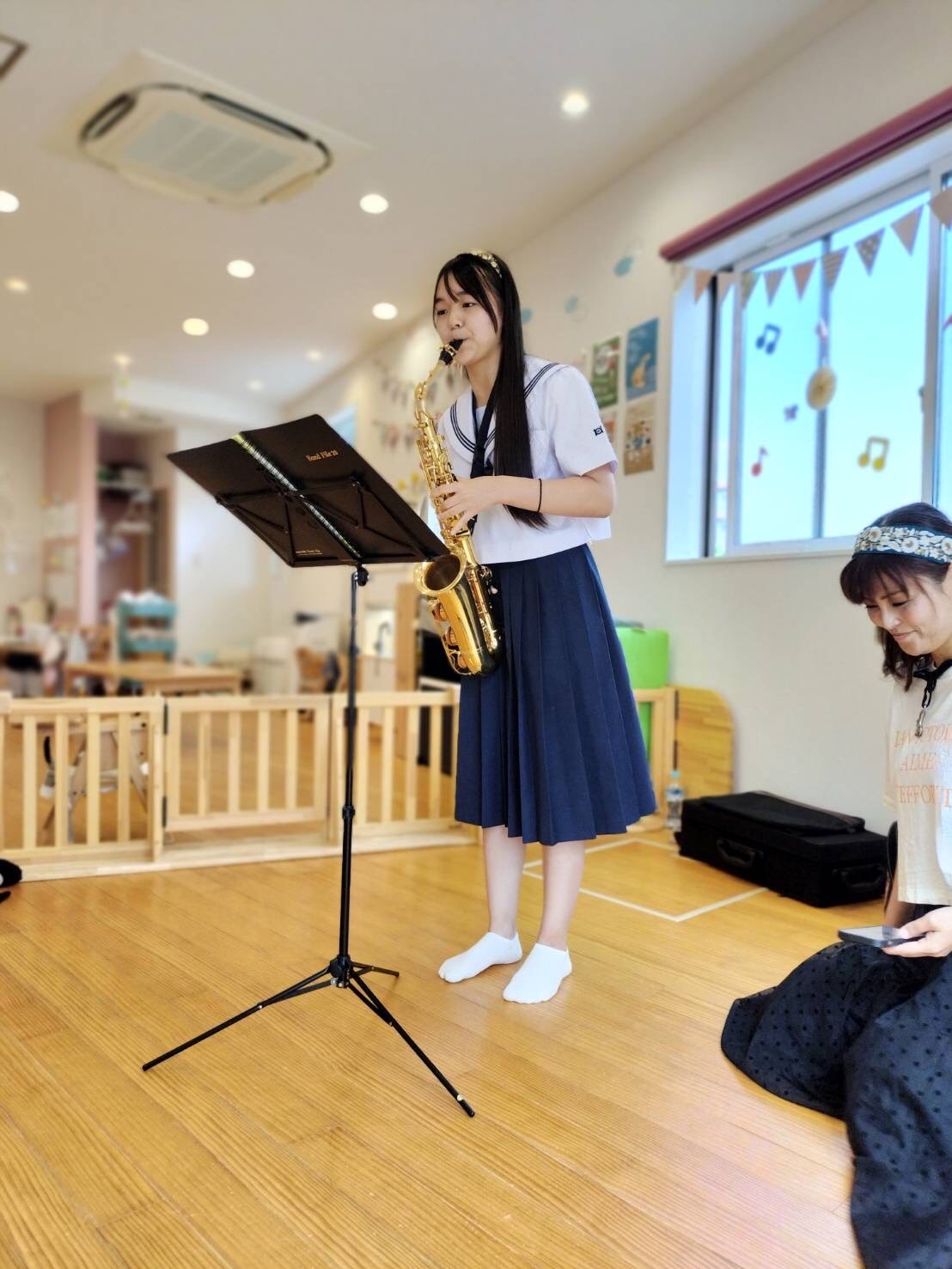 リトミックのまゆみ先生と一緒にいおりちゃんがサックスのミニコンサートに一年ぶりに来てくれました💕サックスが2個もあり♡いつもと違う雰囲気にドキドキワクワクしていた子ども達