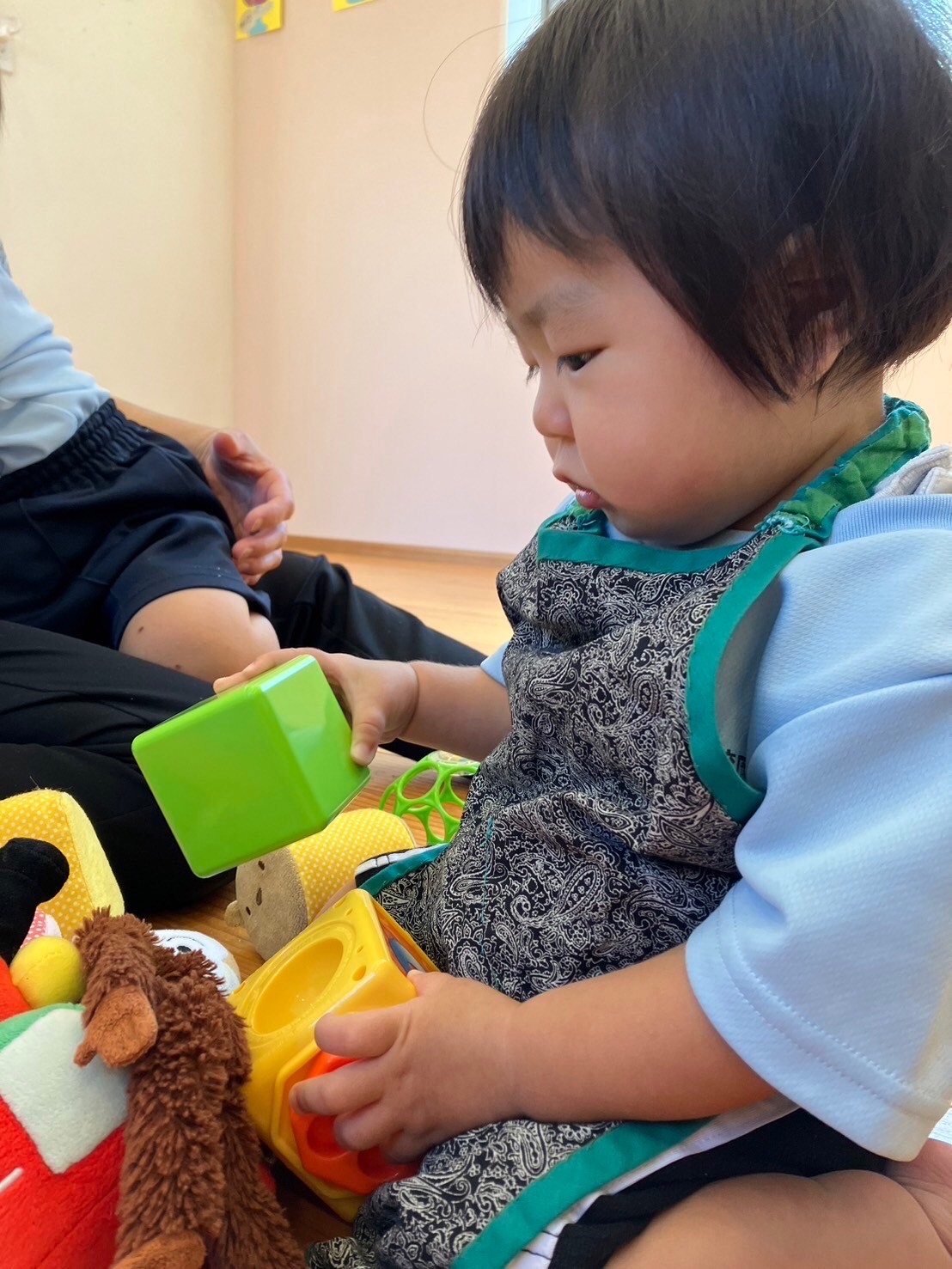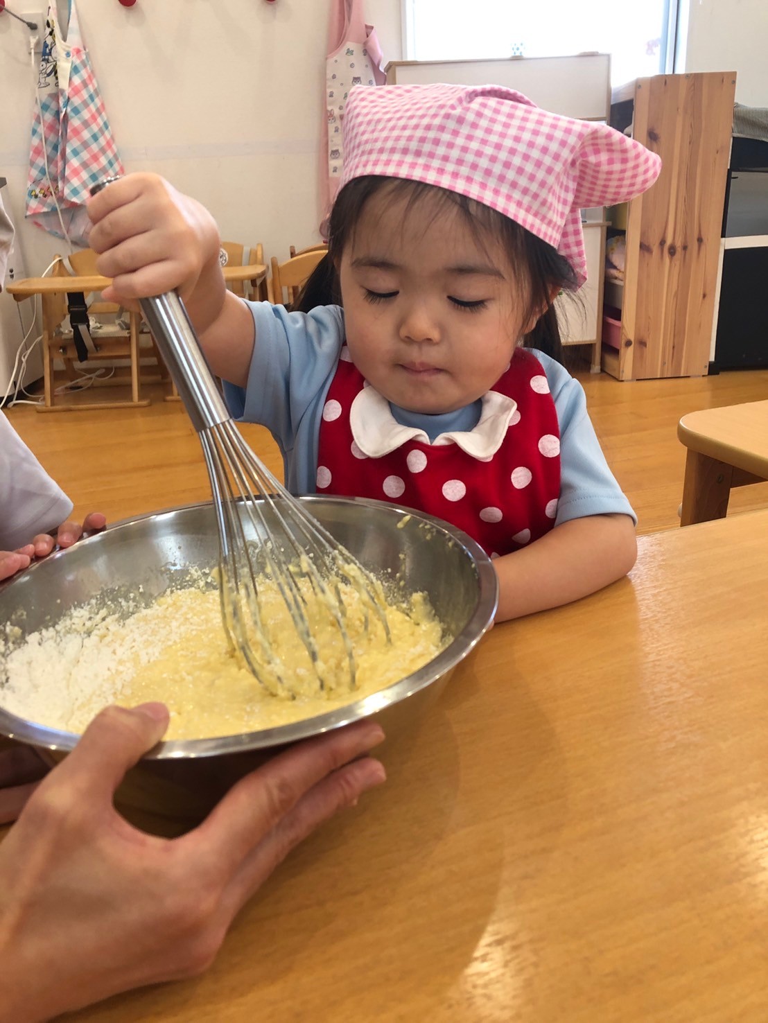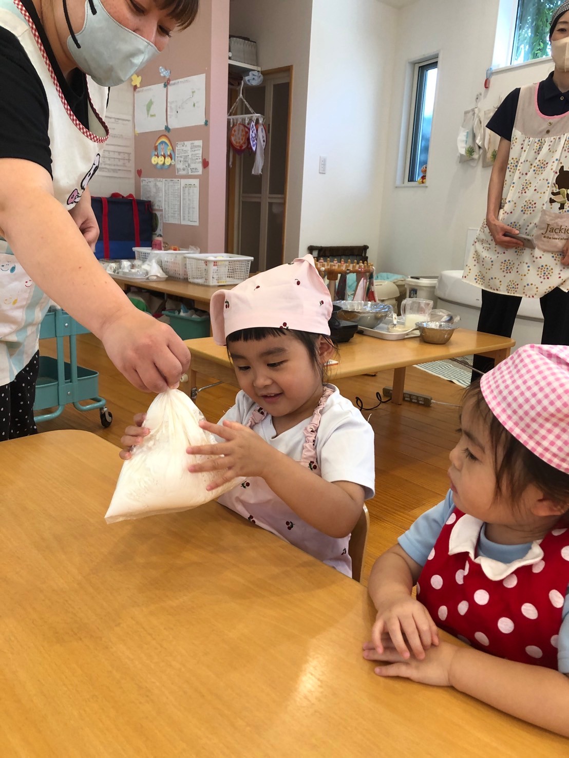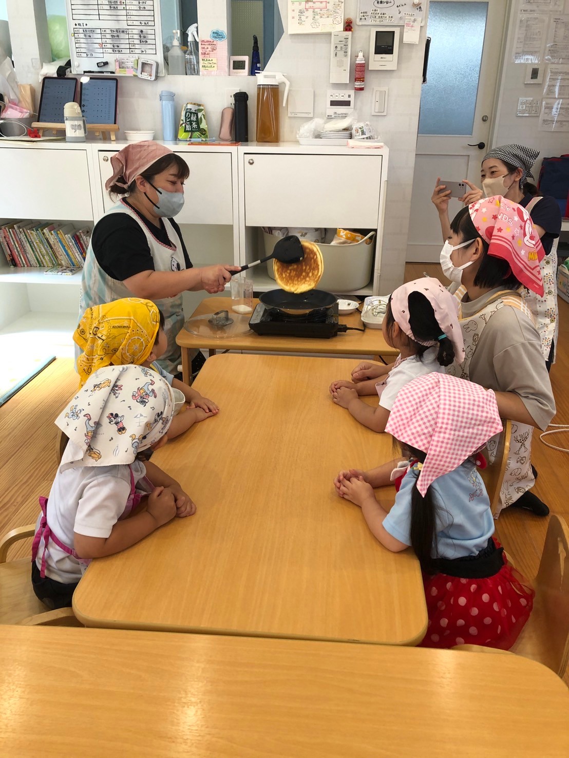 先生がパンケーキの絵本を読みはじめると、おもちゃで遊んでいたお友達も手を洗ってエプロンをつけてくれました🤭