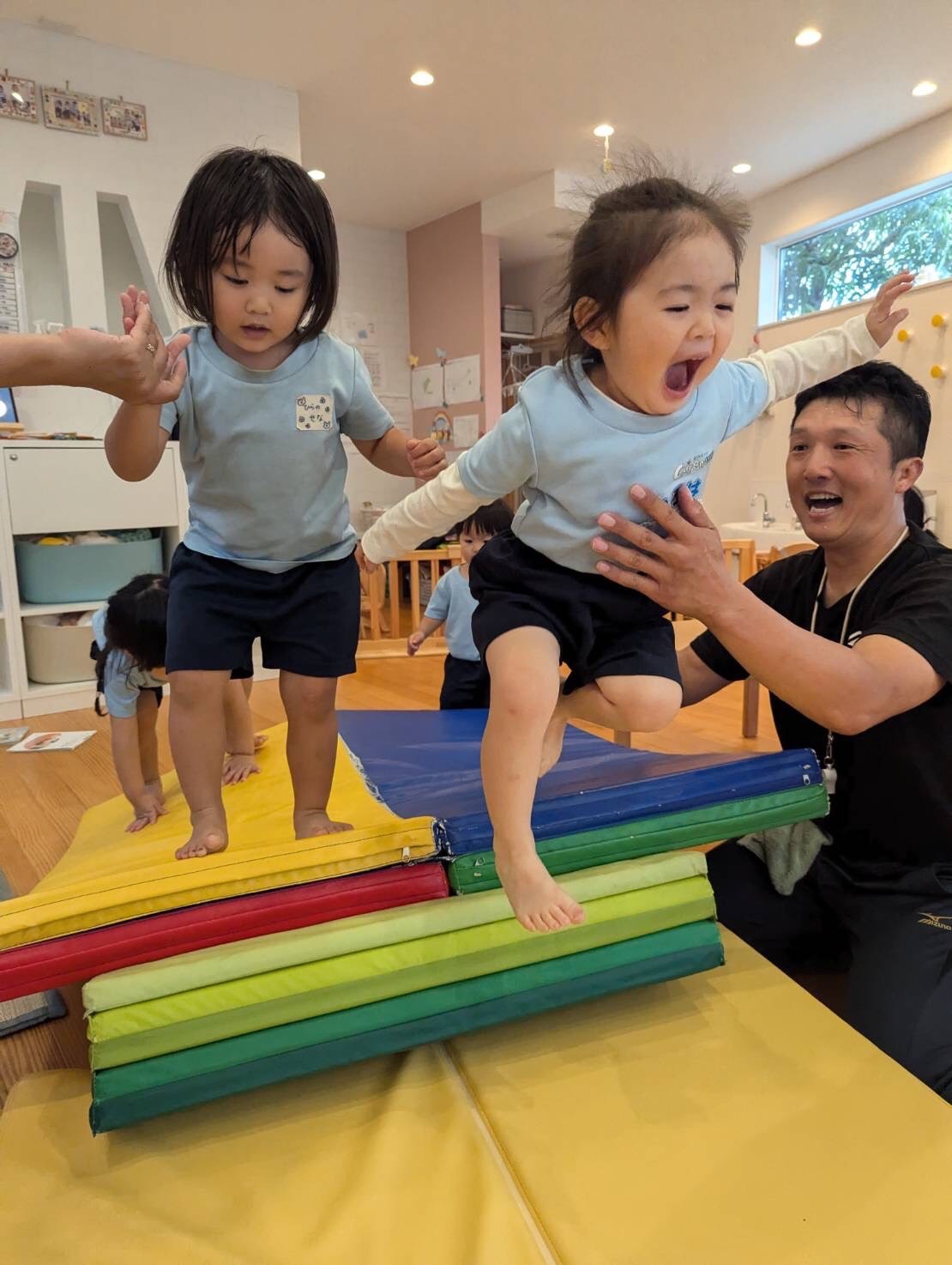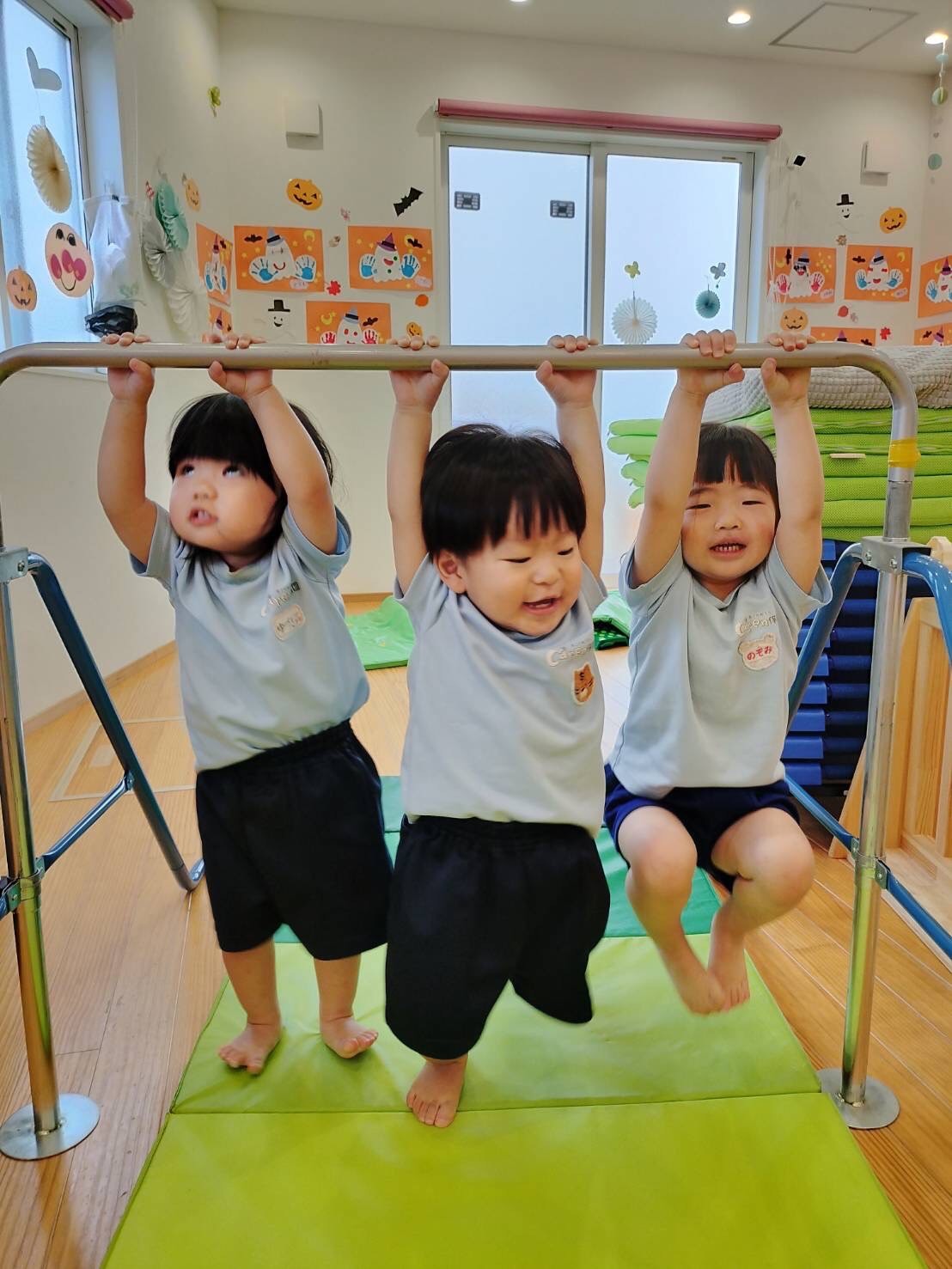 鉄棒にぶら下がったり、でこぼこマットの上をバランスをとって歩いたり、マットの上を四つん這いで上がってからのジャンプ‼️