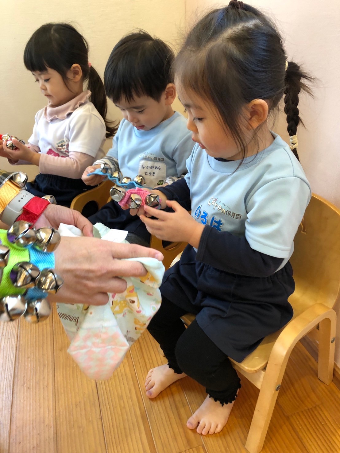 リズム打ちをしたり、カードの絵合わせをしたあとは、腕に好きな色の鈴を付けてクリスマスソングを歌って、鈴の音を奏でて楽しみました♪