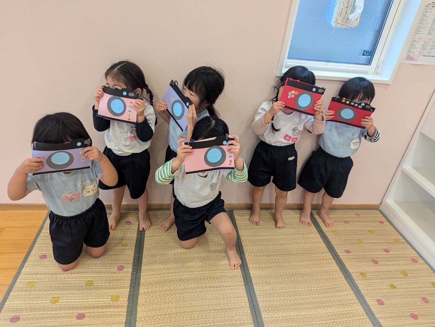 腕に鈴をつけて、こぶしをトントン…👍して音を鳴らしてクリスマスソングも楽しみましたよ♡リトミックのあとは、ぱんだ組さんはカメラを作りました。