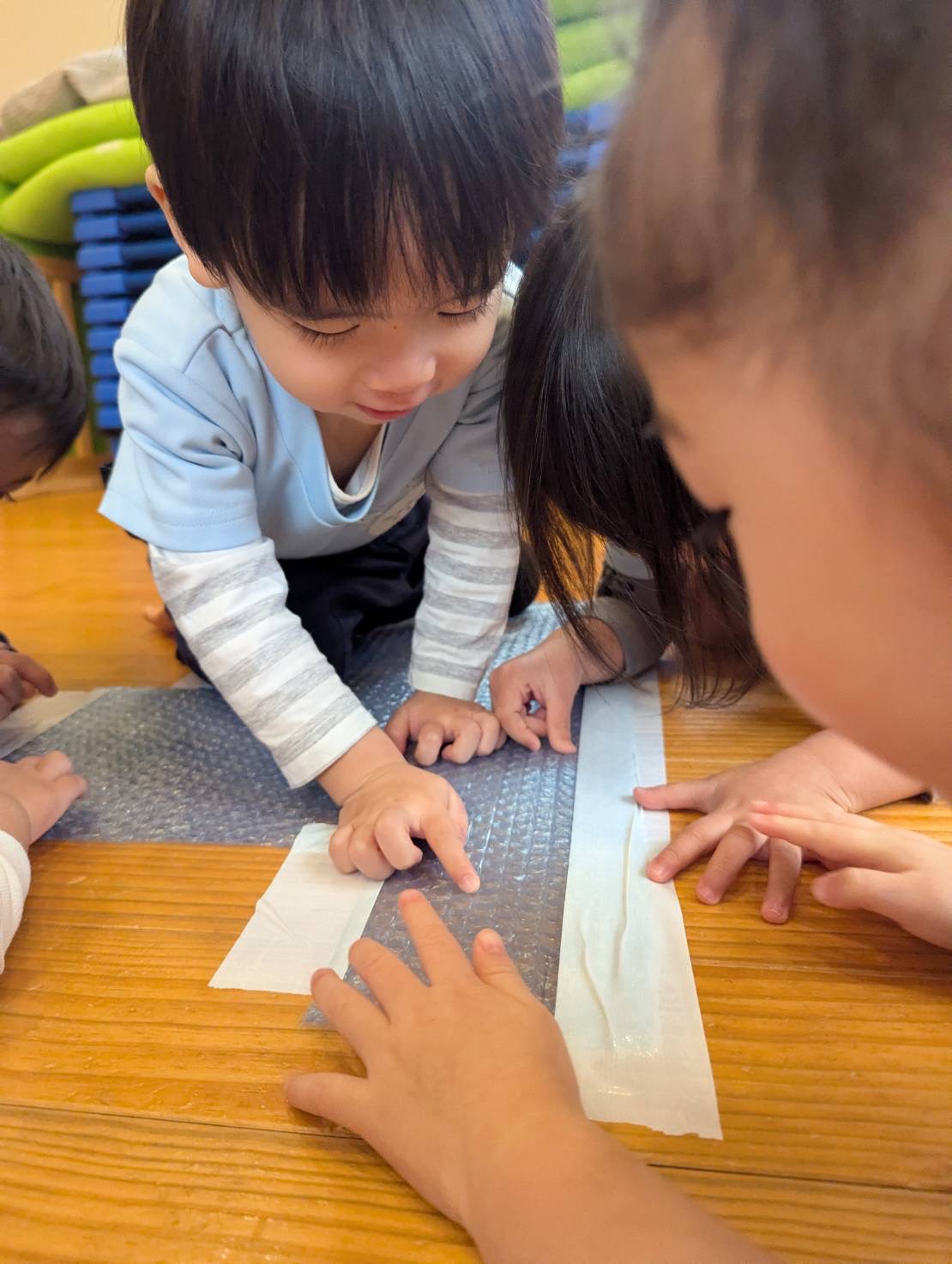 今日は床に梱包シートを貼って指で押したり、足で踏んだりして、感触遊びをしました。