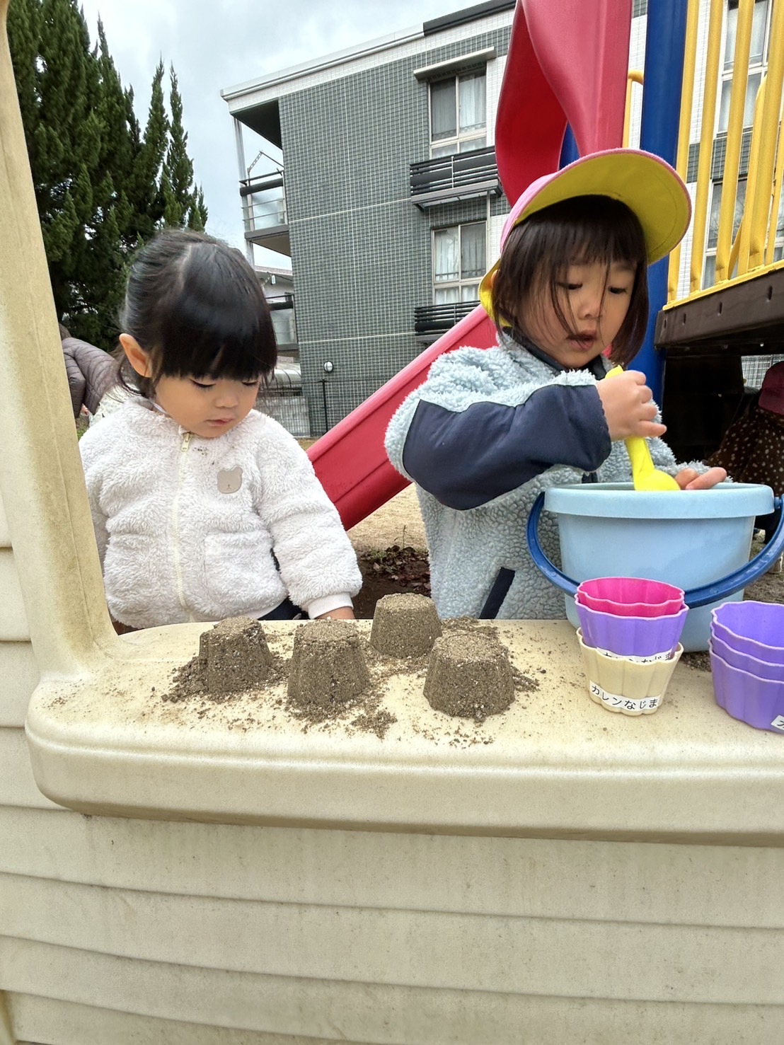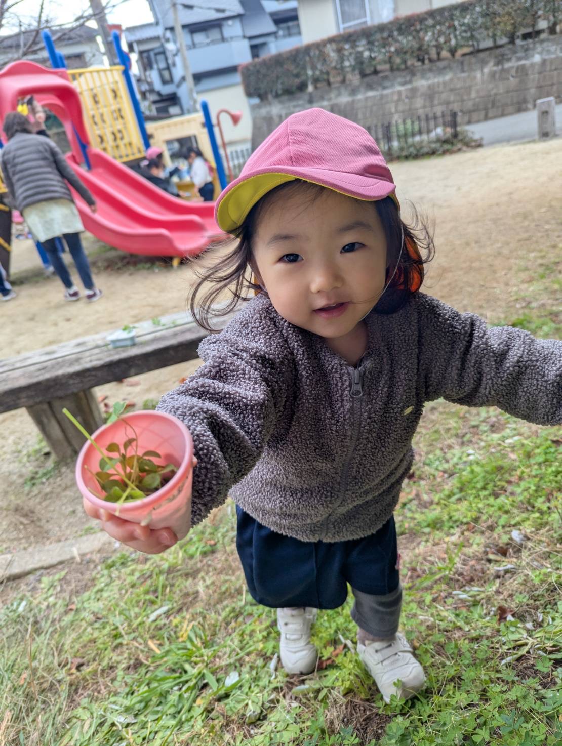 その後は公園にお散歩へ🎶砂遊びや滑り台などで元気いっぱい遊びました😆ベンチに草を並べて八百屋さんごっこをしたり、カップに砂を詰めてアイス屋さんごっこをしたりと、やりとりを楽しむ子どもたちでした💕