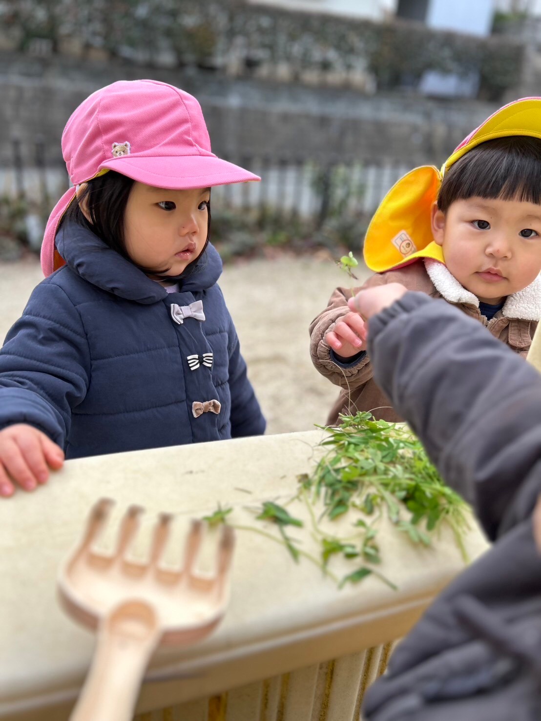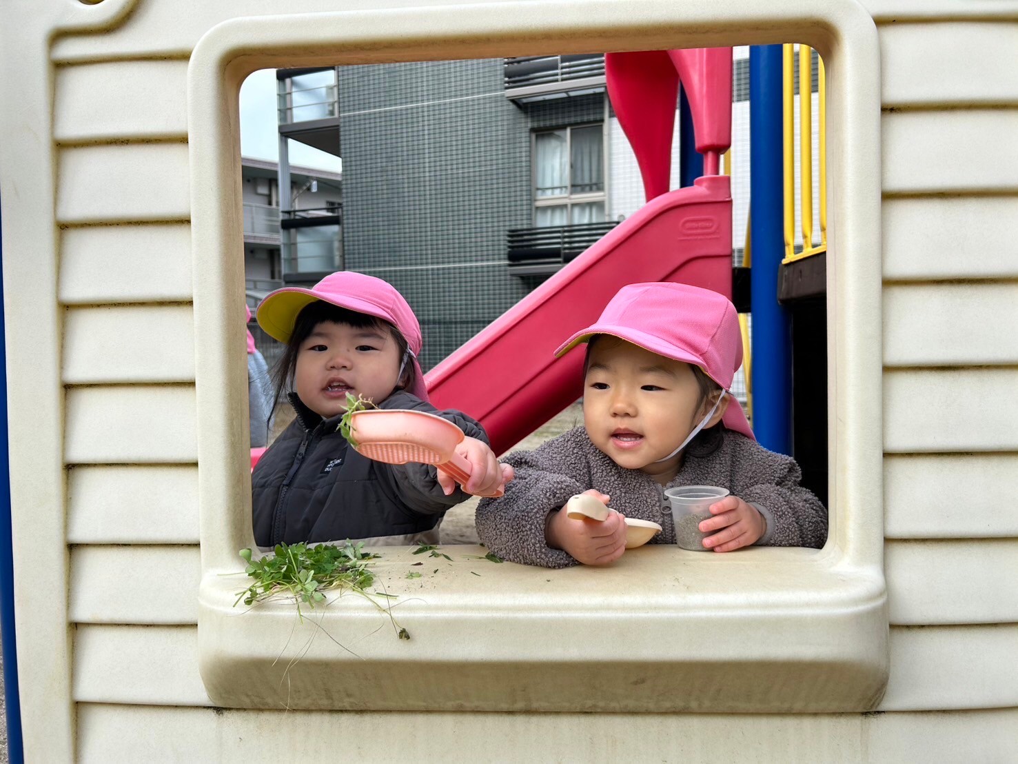 先週末積雪で午前中休園になったので、4日ぶりにみんなとブロック遊びをして盛り上がりました🏠🌳その後、お天気が良かったのでみんなで高又公園へ遊びに行きました❣️お日様がさして気持ちよく、滑り台を滑ったり、砂をたくさん集めてカップケーキやお弁当を作ったり、ミツバや葉っぱを飾ってクッキングを楽しみました(料理)🍮お片付けの時間になると「かえりたくなーい」コール😅💦「カラスがみんなを見てるよー🐦⬛」とカラスが飛んでこないか心配しながらイソイソと園へ戻りました💦