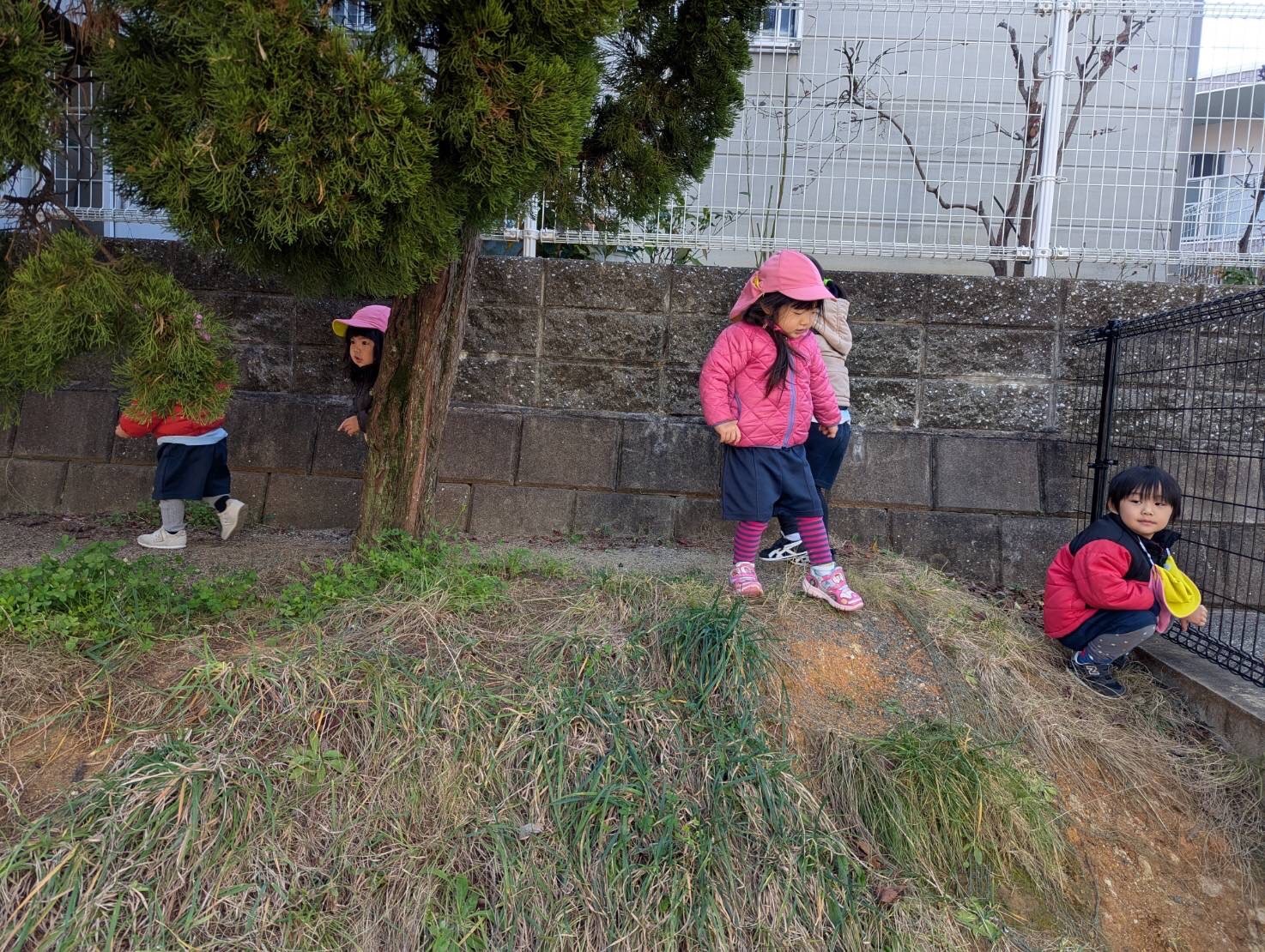 園児さんたちは小さな丘を登り降りしてたくさん走ったり、