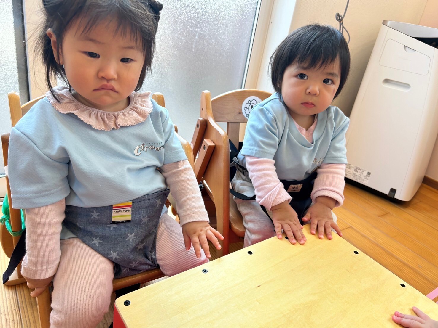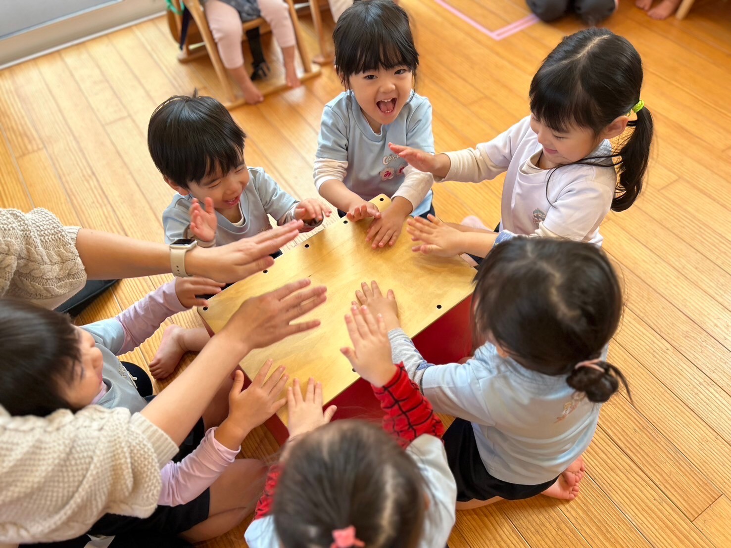 りす組さん、ひよこ組さんも順番にトントンとカホンを叩いて振動や音の響きを感じていました🥰「たまごまごまご」や「バスに乗って」も大合唱✨