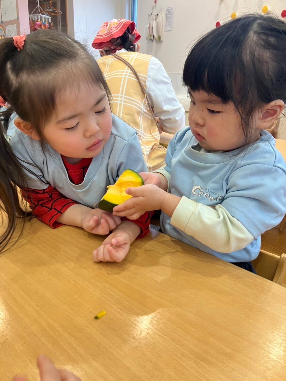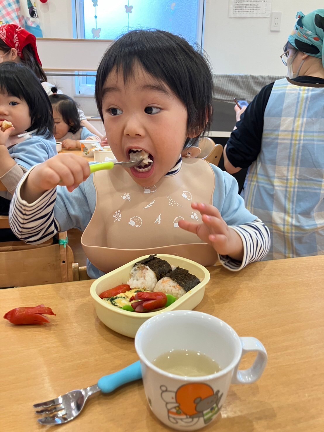とお話しながら、となりのお友だちにお野菜を渡していました✨待ちにまったお弁当タイムでは、