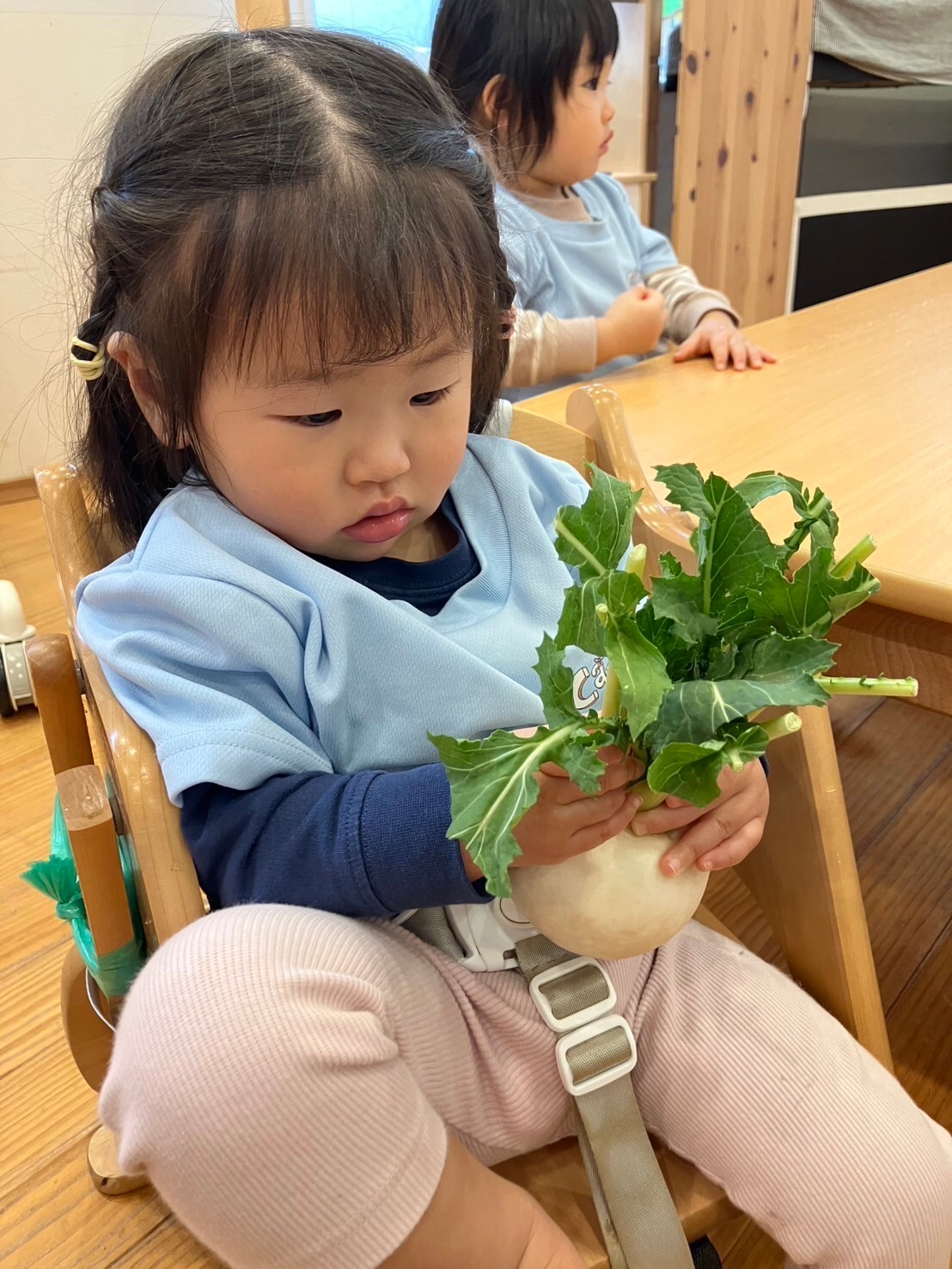 カブの葉を切る時、耳をすましている園児さんたち。。✨💕