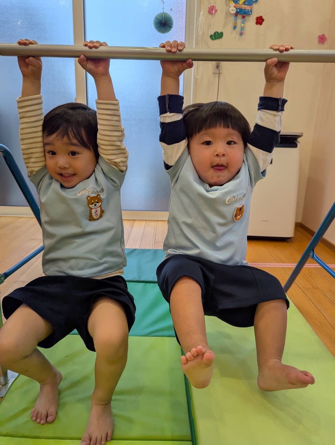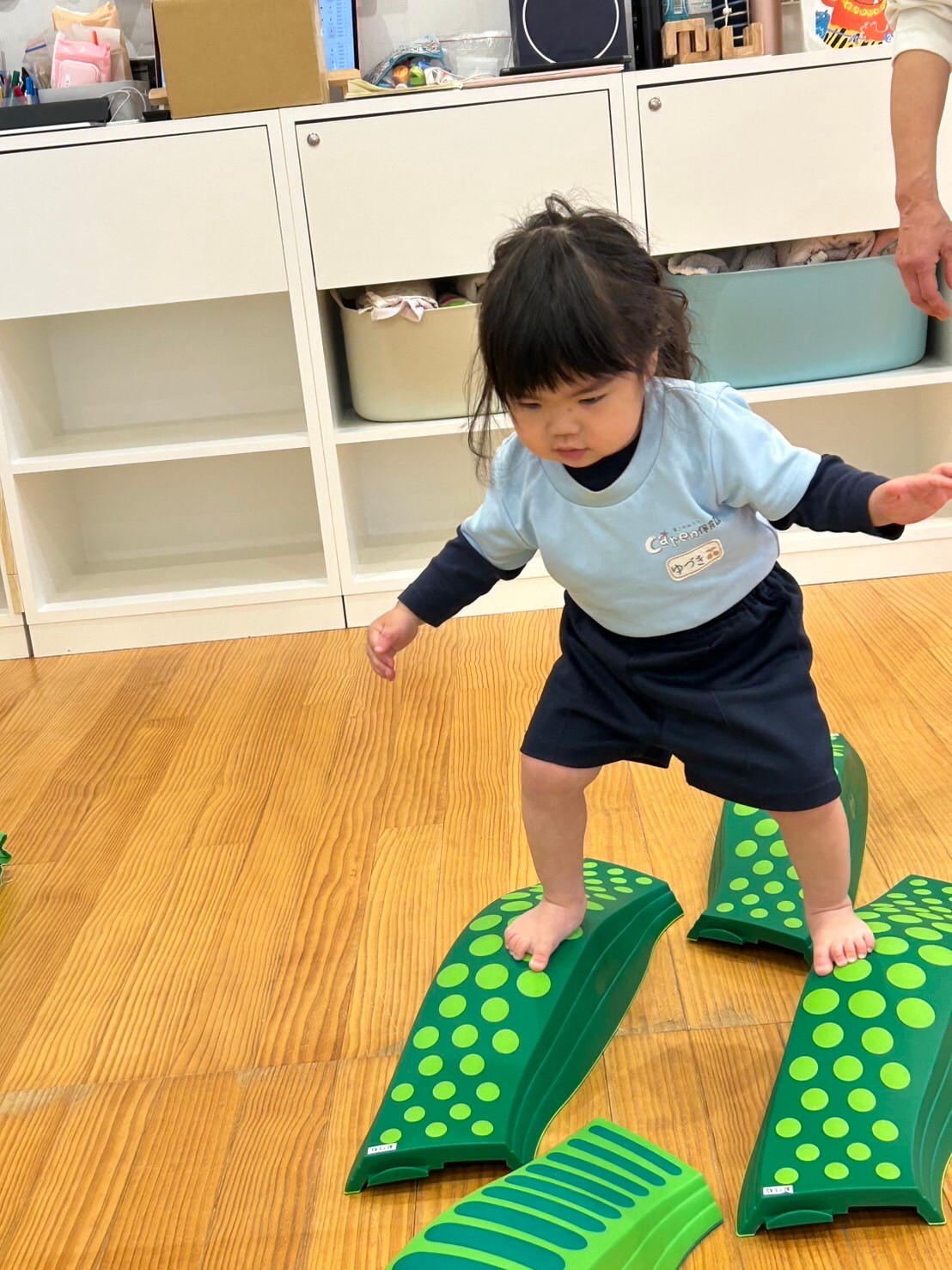マットの上でジャンプをしたり横転したり、鉄棒やバランスウェーブの上を歩いたりしましたよ🥰