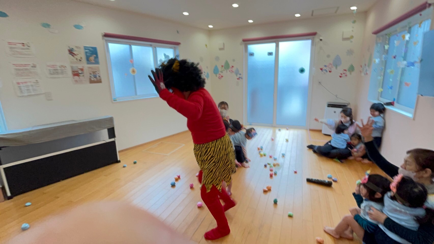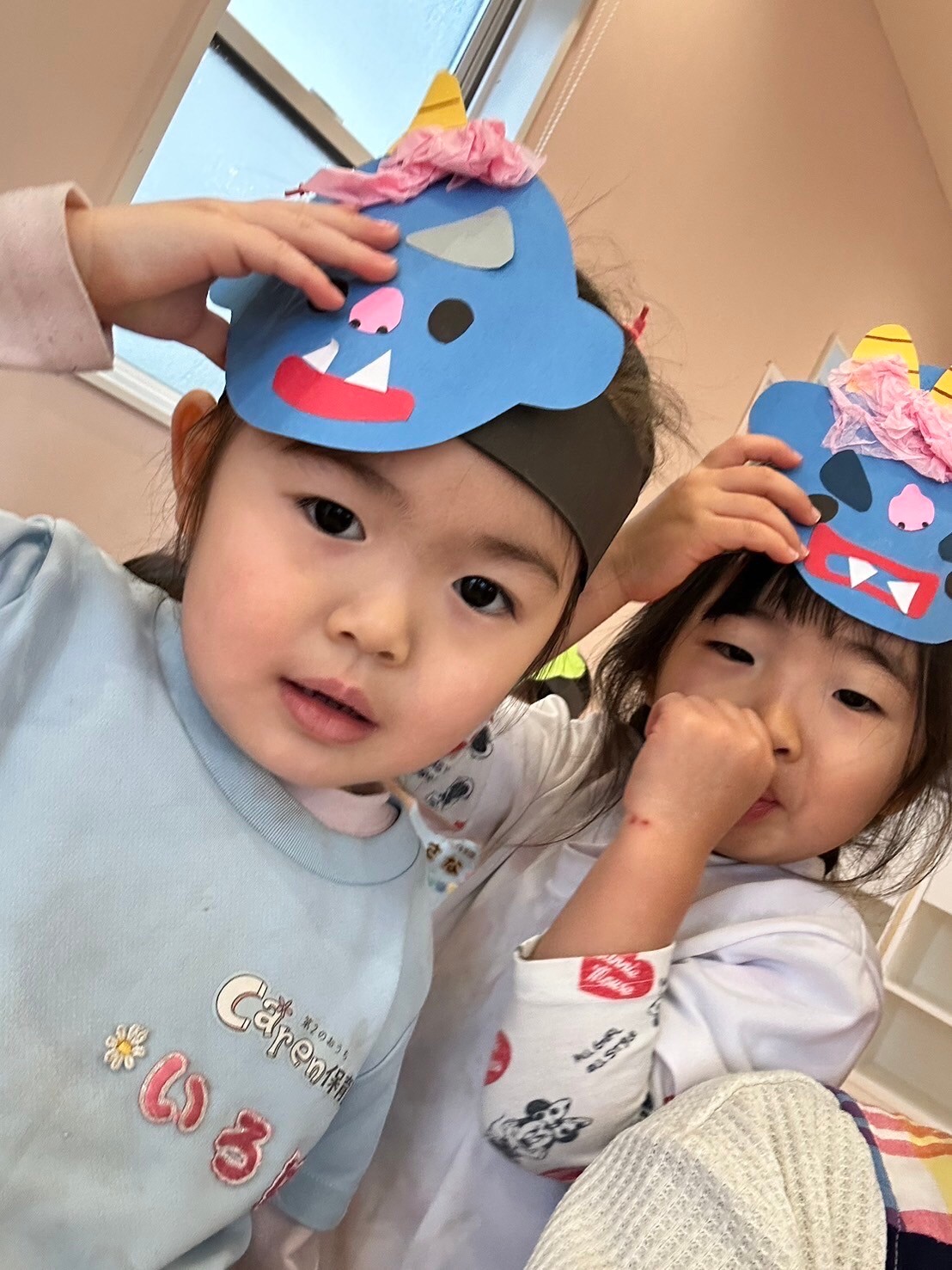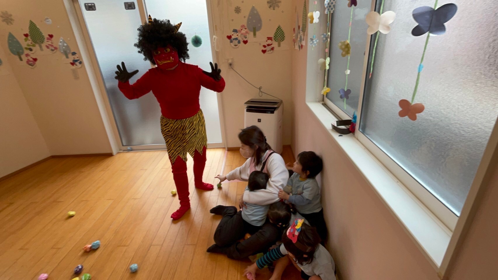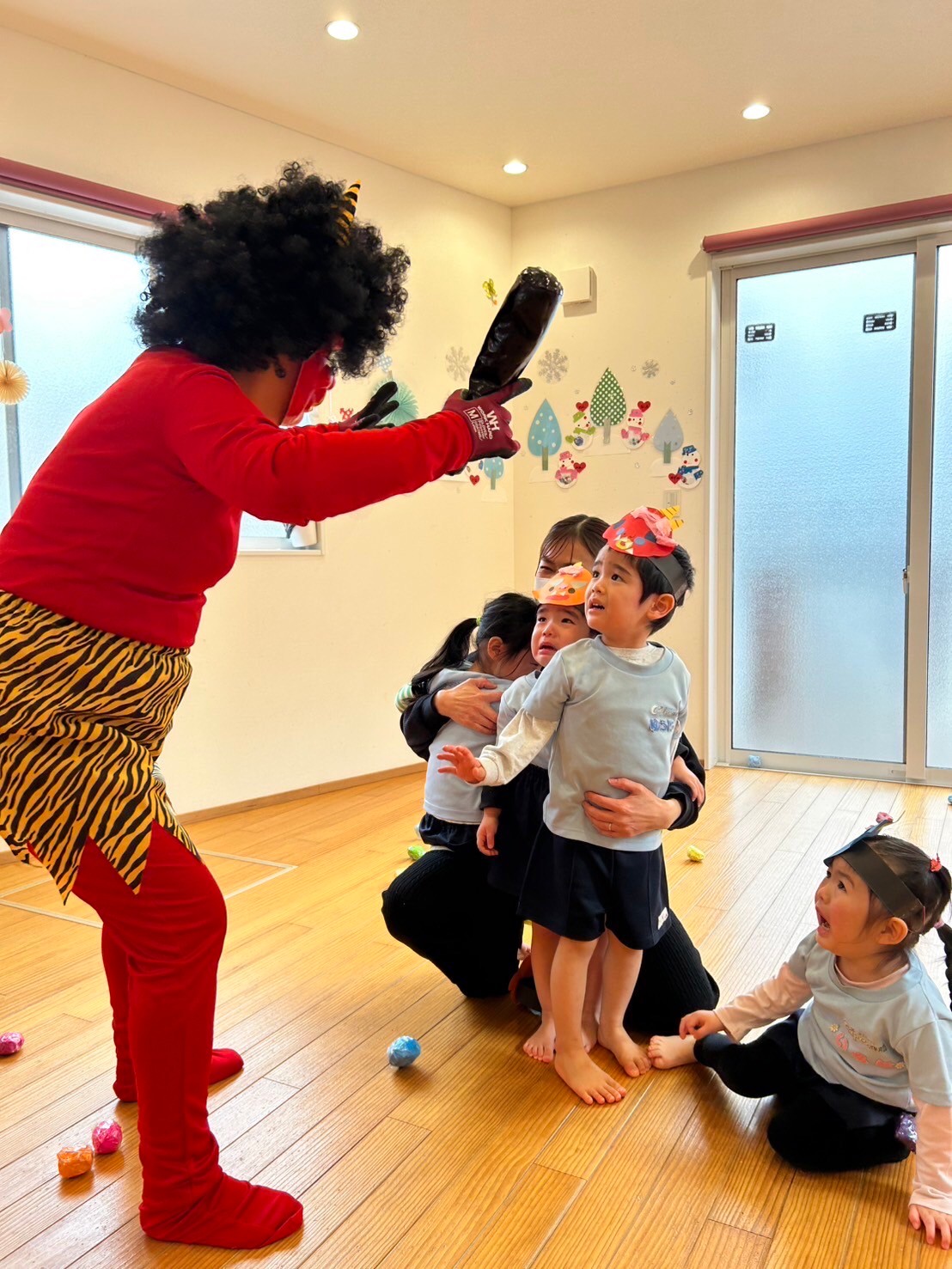 お面を付けて、節分の絵本を読んで「オニは外!するよ✊」と意気込んでいた子ども達ですが…。
