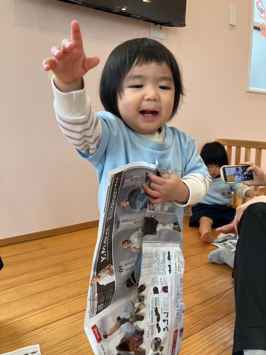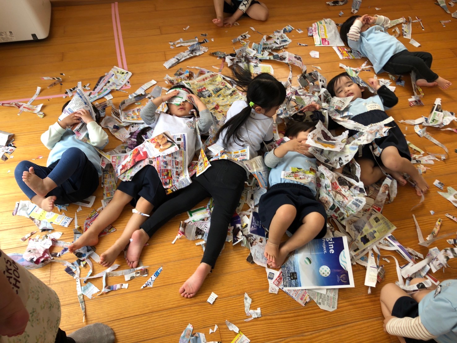 ビリビリと新聞紙を破る音を楽しんだり、友達に新聞紙をお布団のように掛けたりと室内遊びを楽しみました。