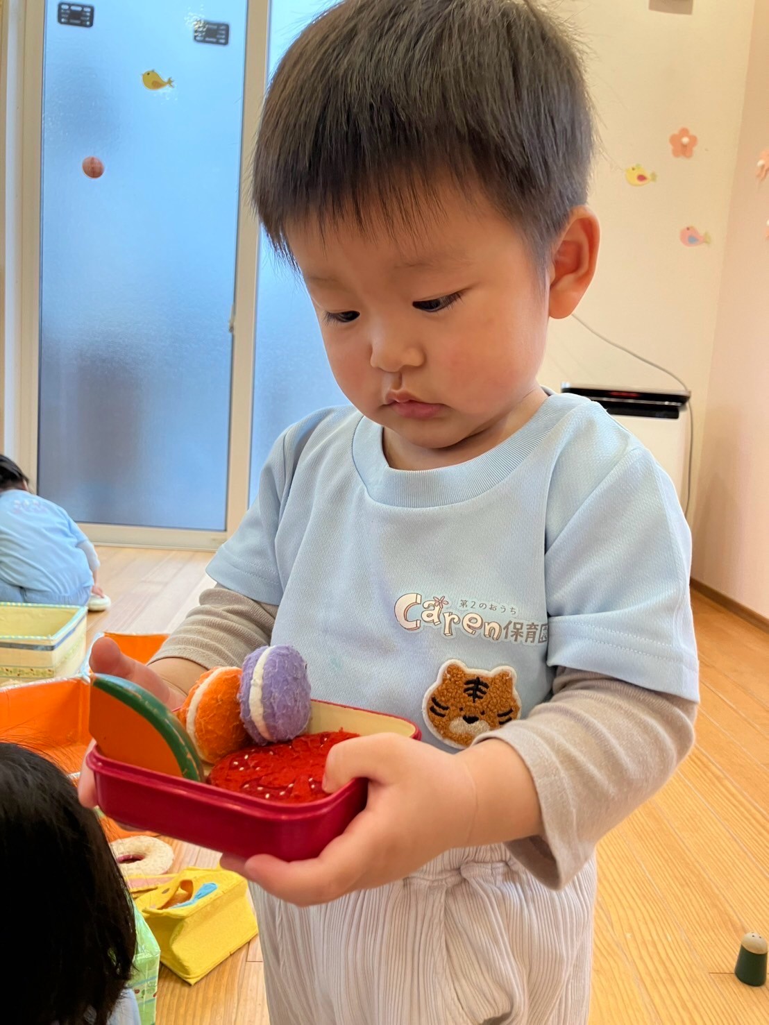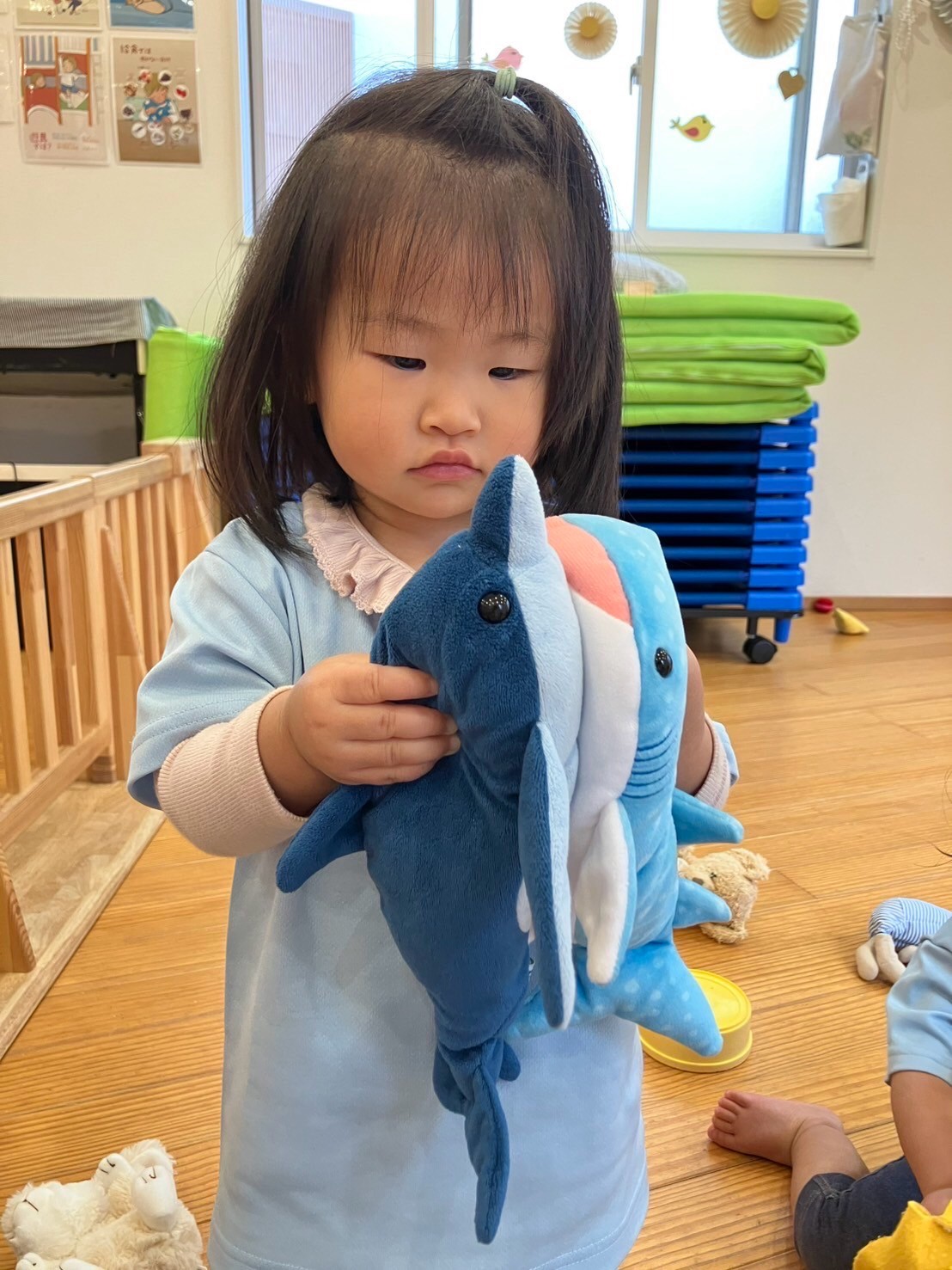 タオルであたまや体を拭き、お着替えをして、りすひよこさんは室内でパイナポー体操や昆虫体操をしたあとはぬいぐるみ遊びをしました✨