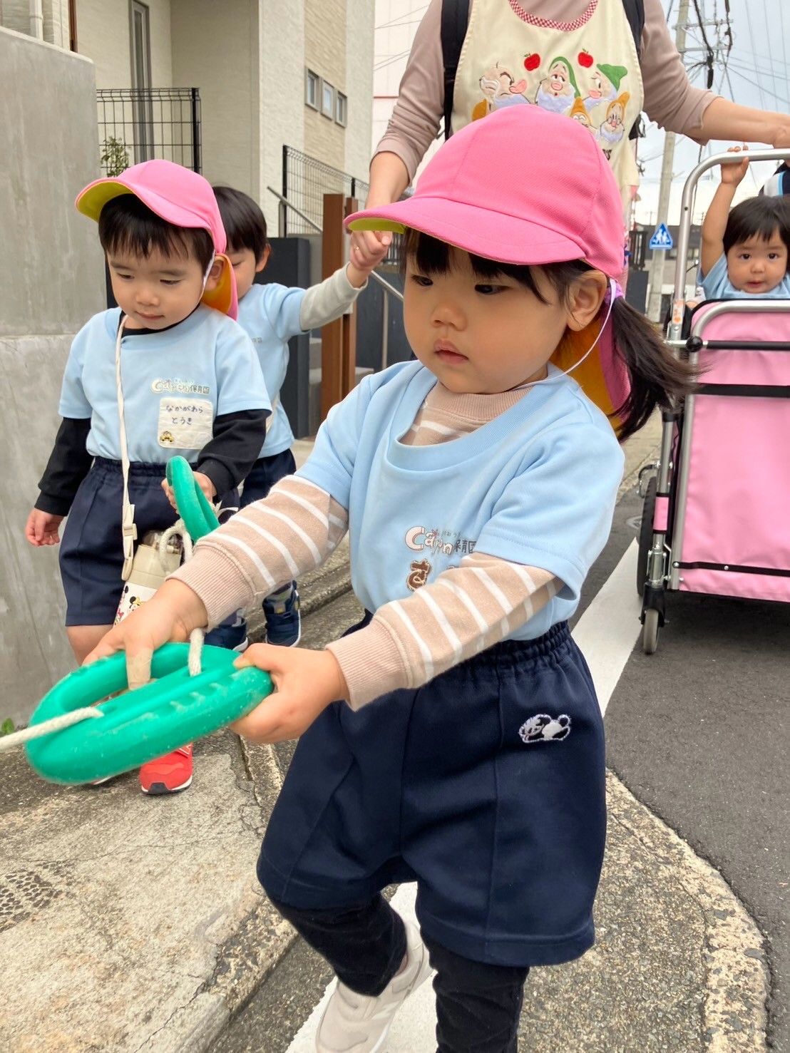 ひよこりすさんは先生に抱っこされ、バギーへ💦