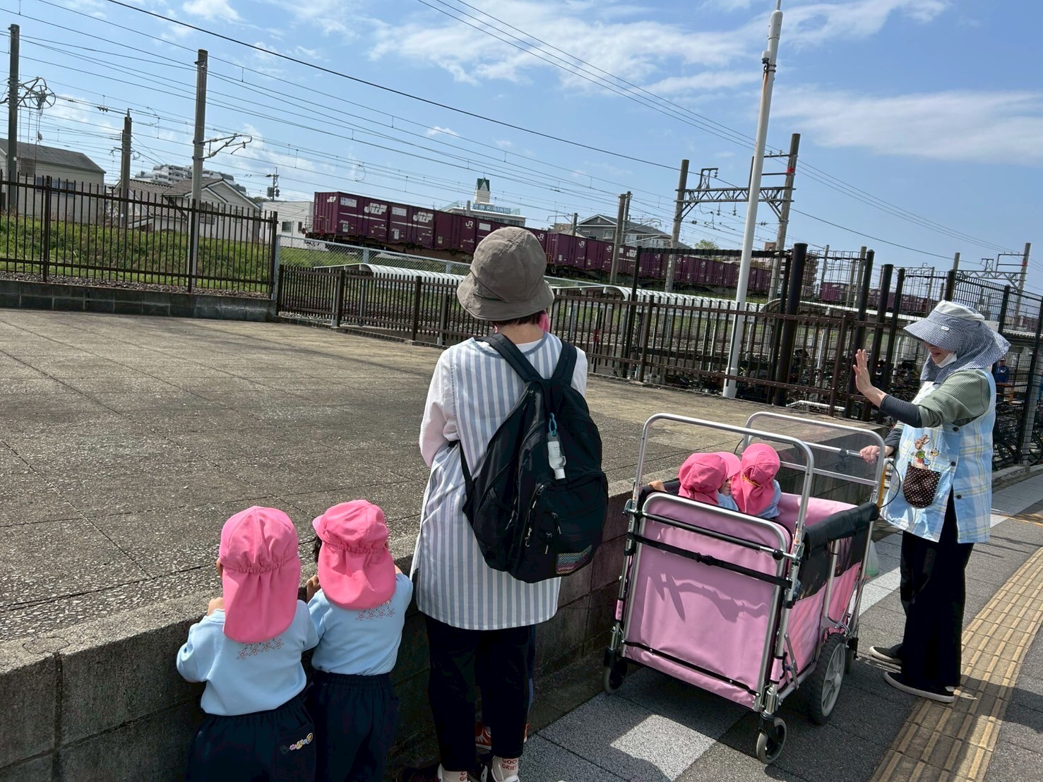 電車をみたり、バイクに乗ったおまわりさんがブゥーンと園児さんたちの近くにとまってくれ、
