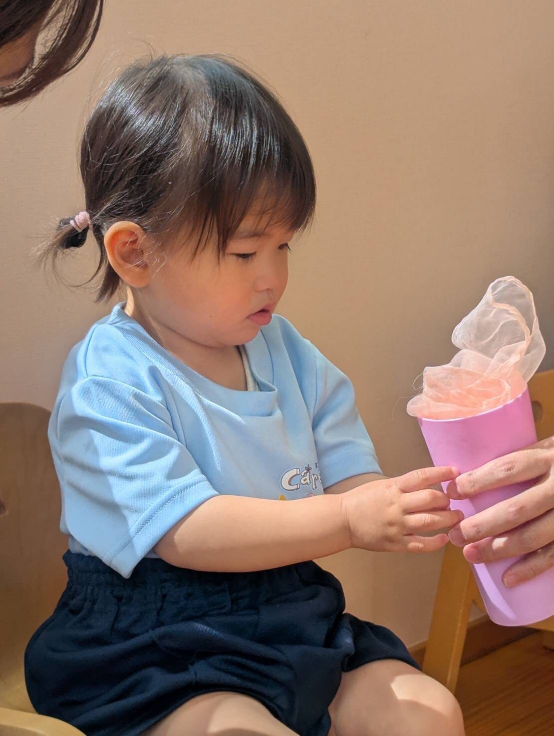 カップとカラーシフォンを使ってカップの中でシフォンを混ぜ混ぜしたり、揺らしたりして「ミックスジュース」の歌に合わせて、ジュースを作りました♪
