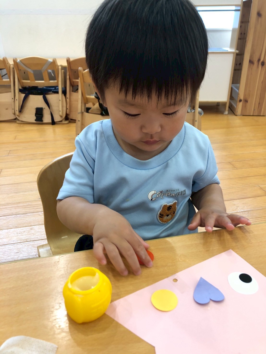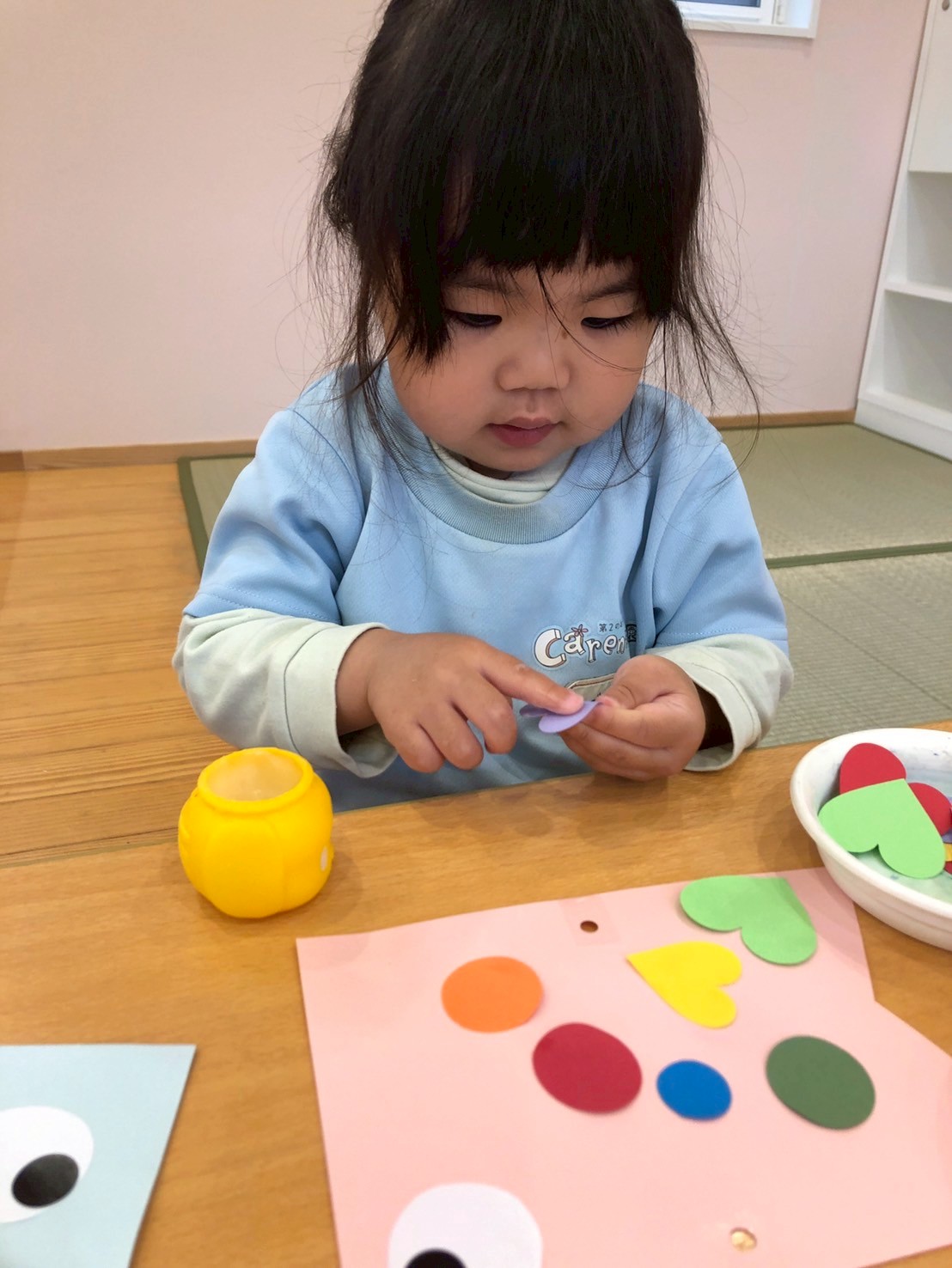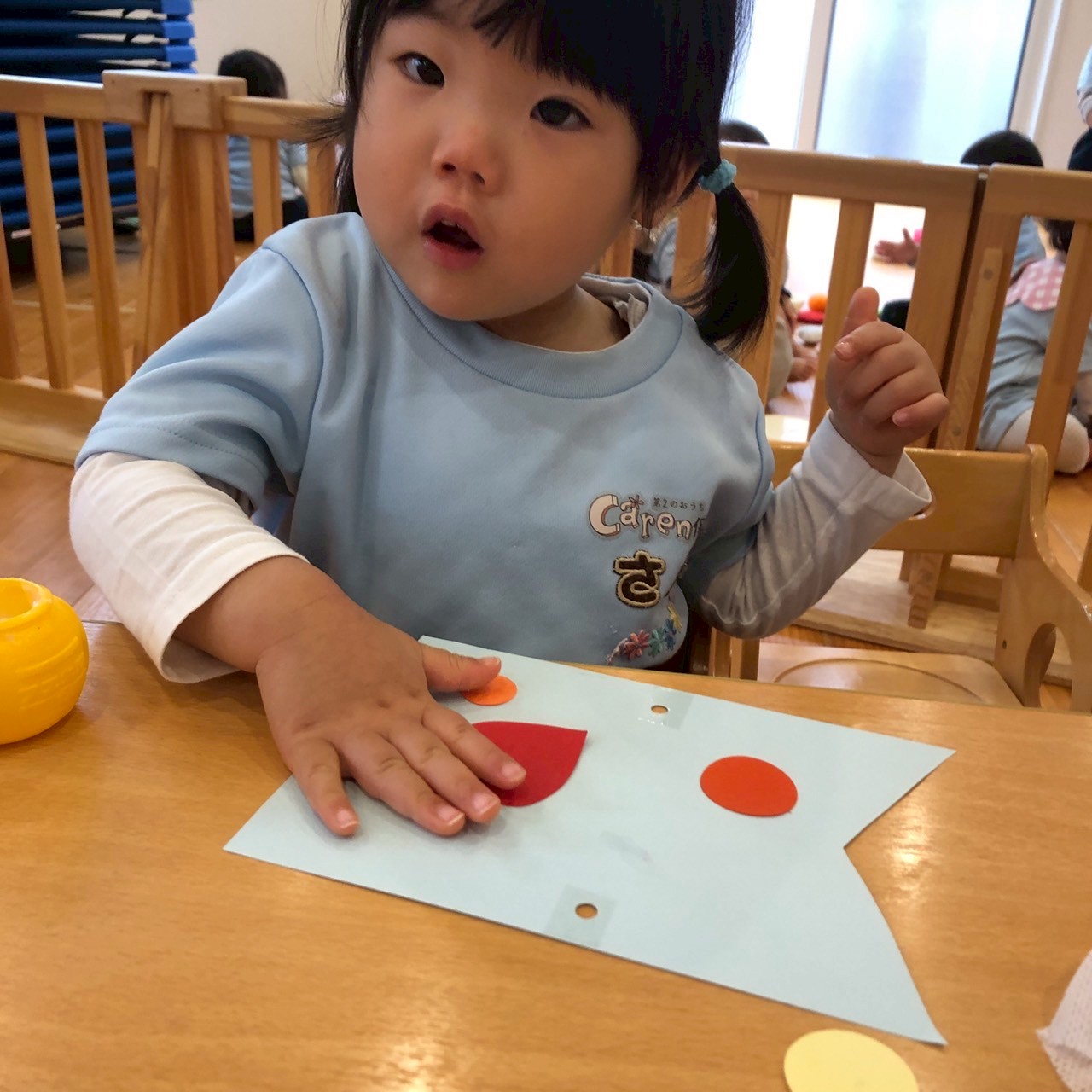 鯉のぼり製作では、ハートや丸のパーツを保育者と一緒に糊付けしました。