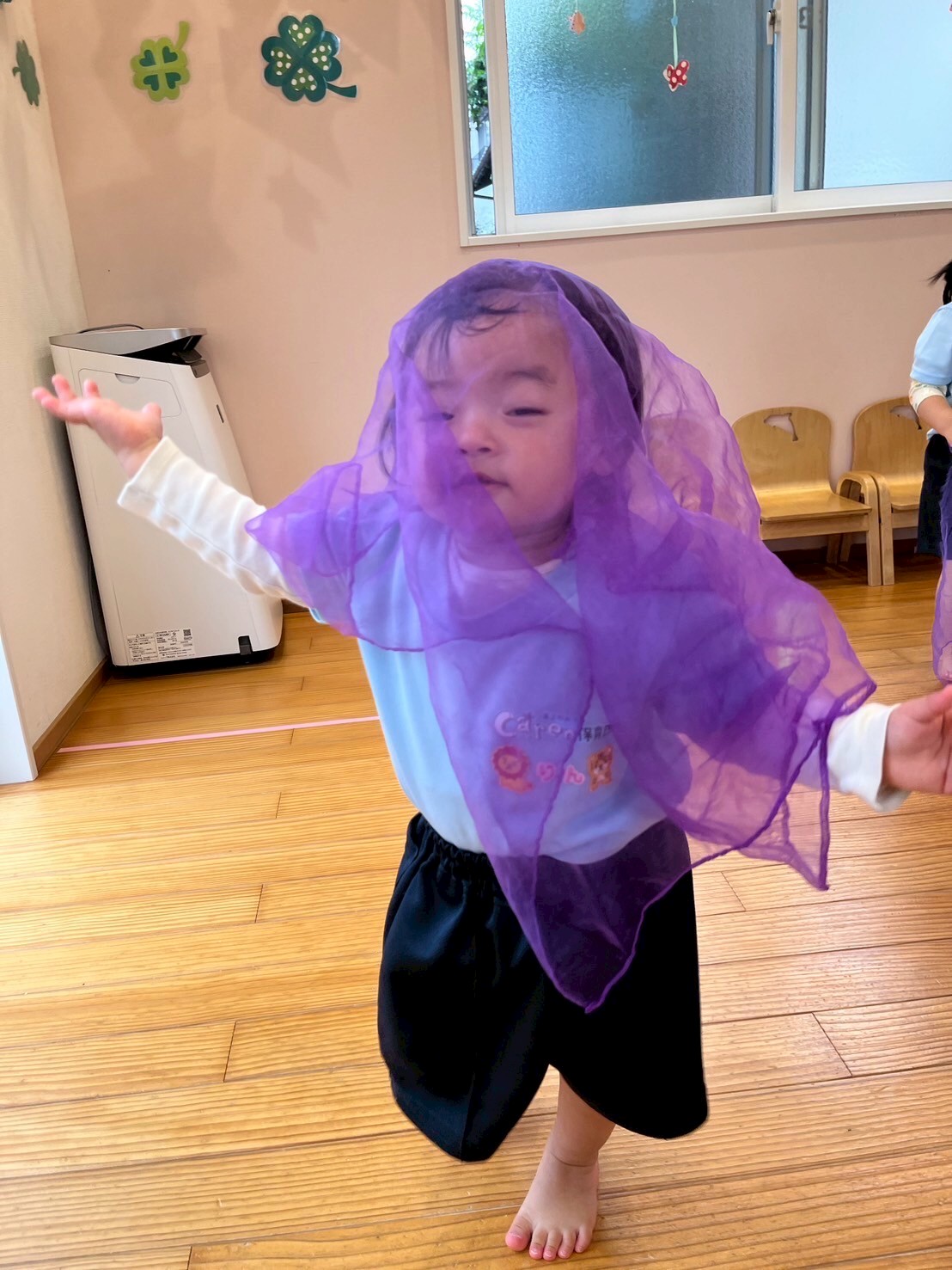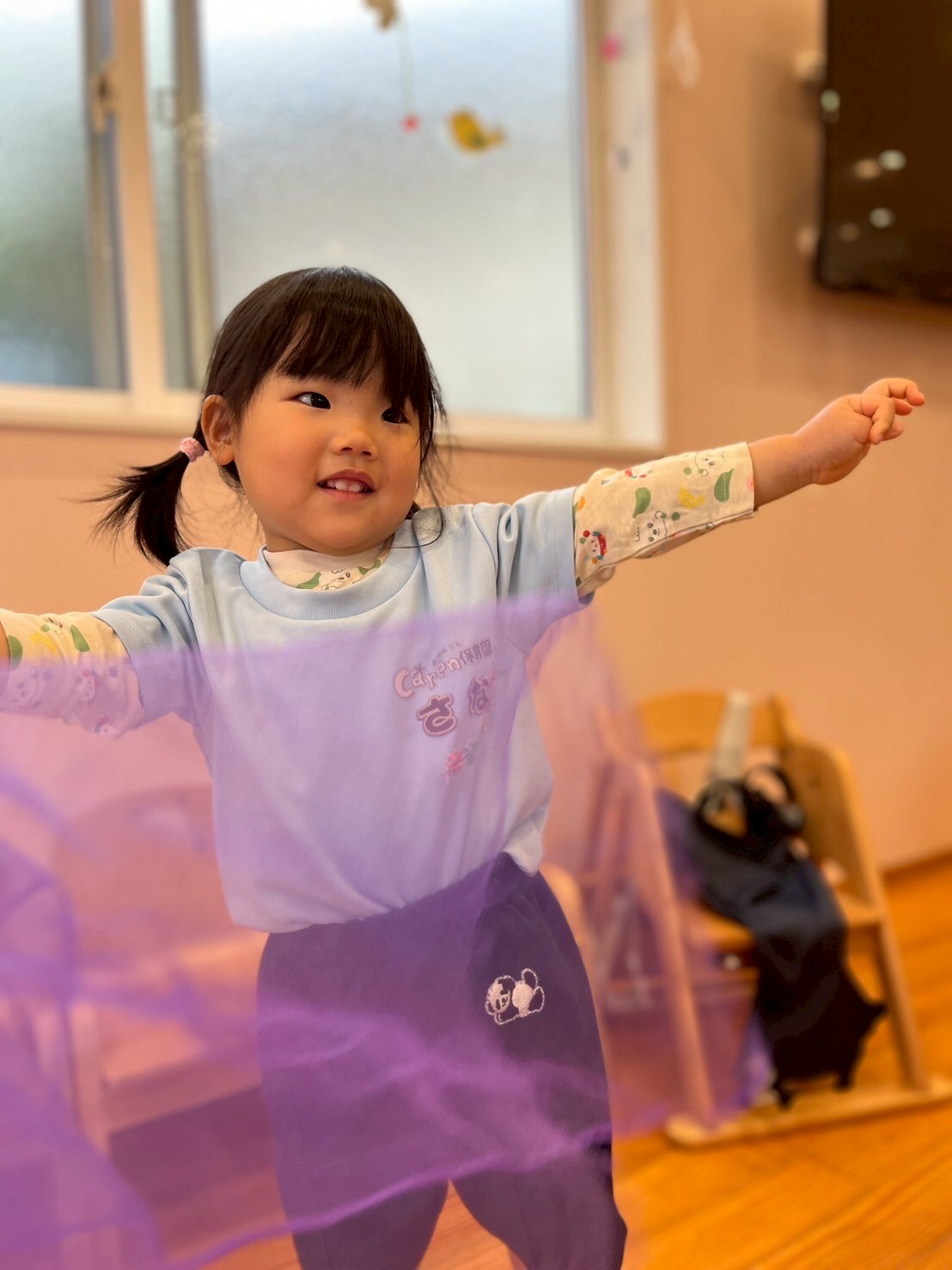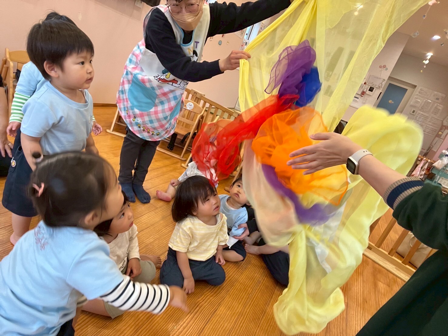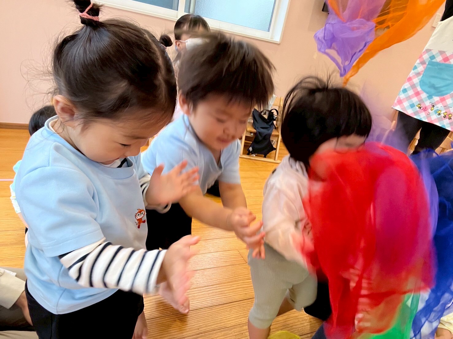 今日もお友だちは元気いっぱい☺️✨リトミックでは、音楽に合わせてカラフルなシフォンをゆらゆら〜🌈🎶