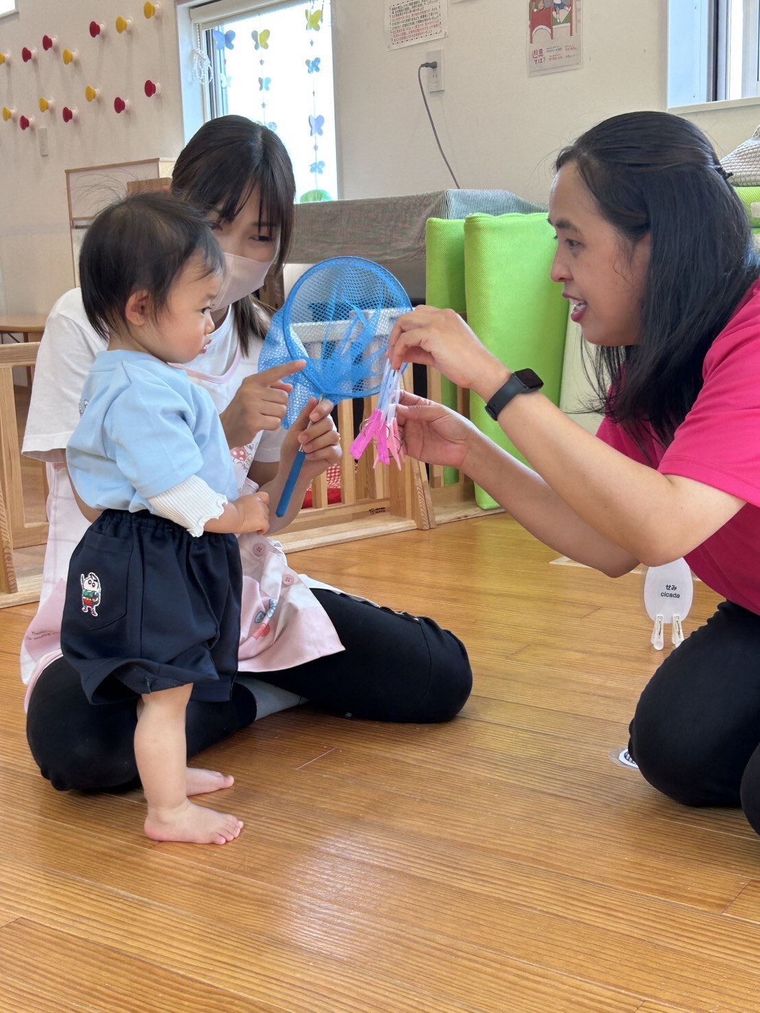 昆虫の名前を教えてもらい、網を持って教えてもらった昆虫を捕まえていきましたよ💕