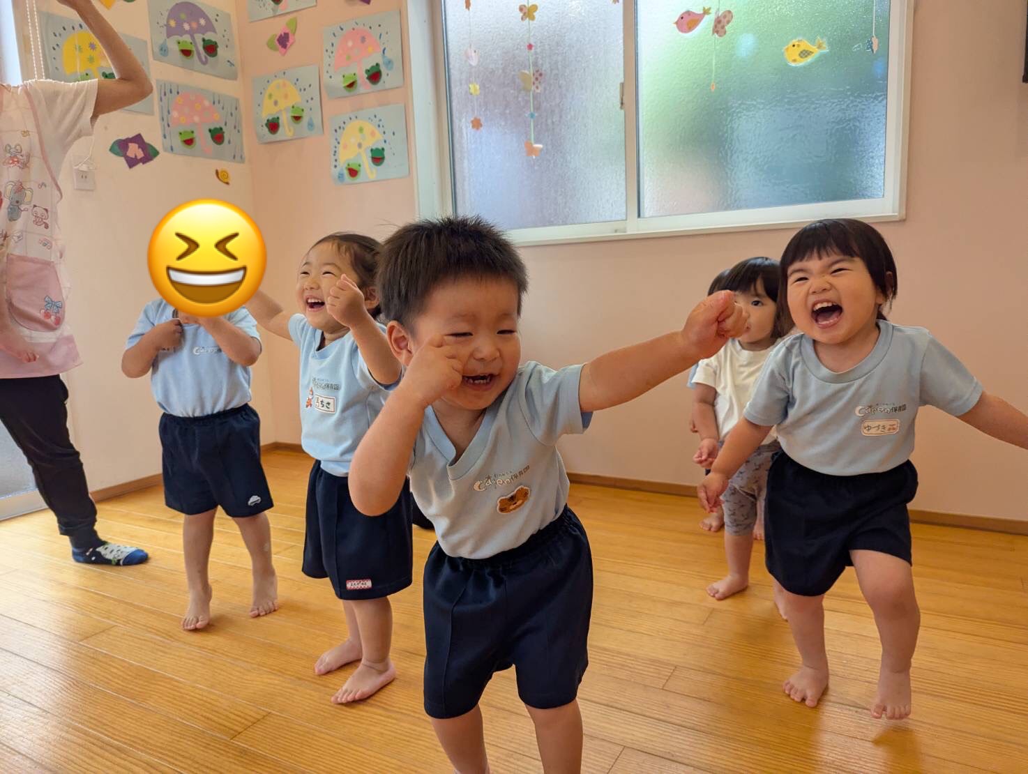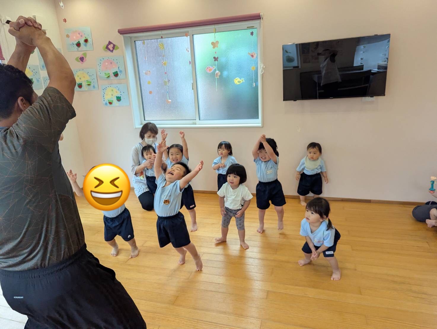 柔軟体操ではだあ先生の動きをマネっこして、しっかり身体をほぐし『筋肉マッチョ💪』のポーズも決まっていた子ども達🌟