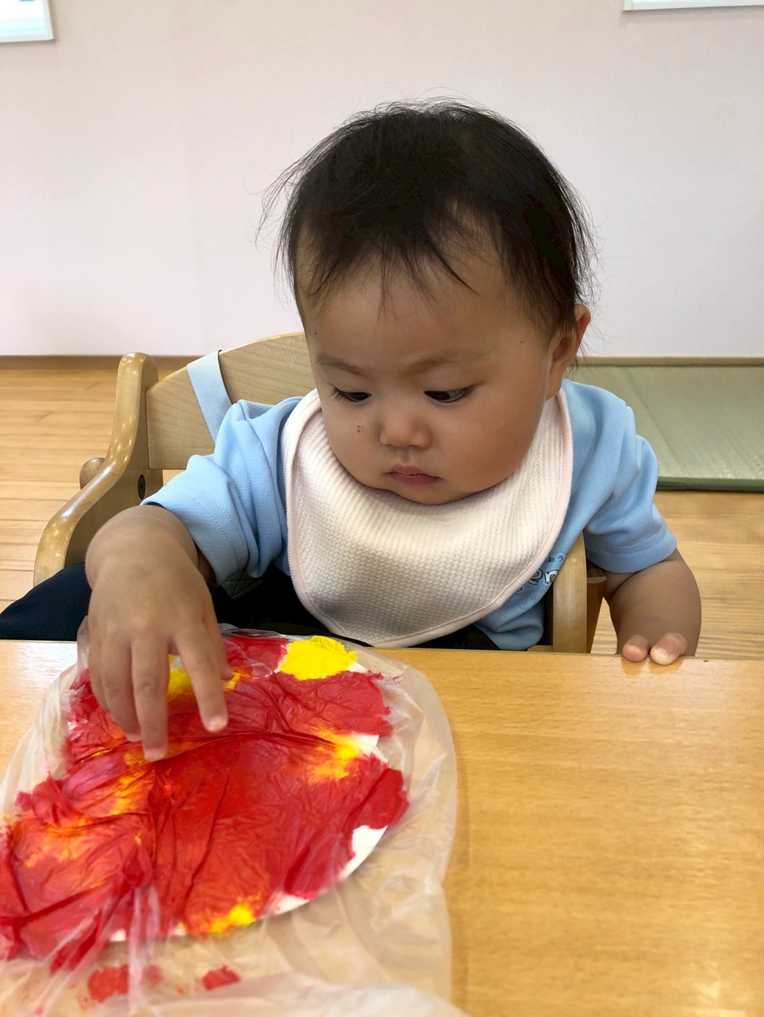フルーツのダンスや『ベイビーシャーク』をノリノリで踊って、楽しく参加していました😆💕英語レッスンの後は、りんごとあおむしの製作をして絵の具の感触を楽しみました🍎