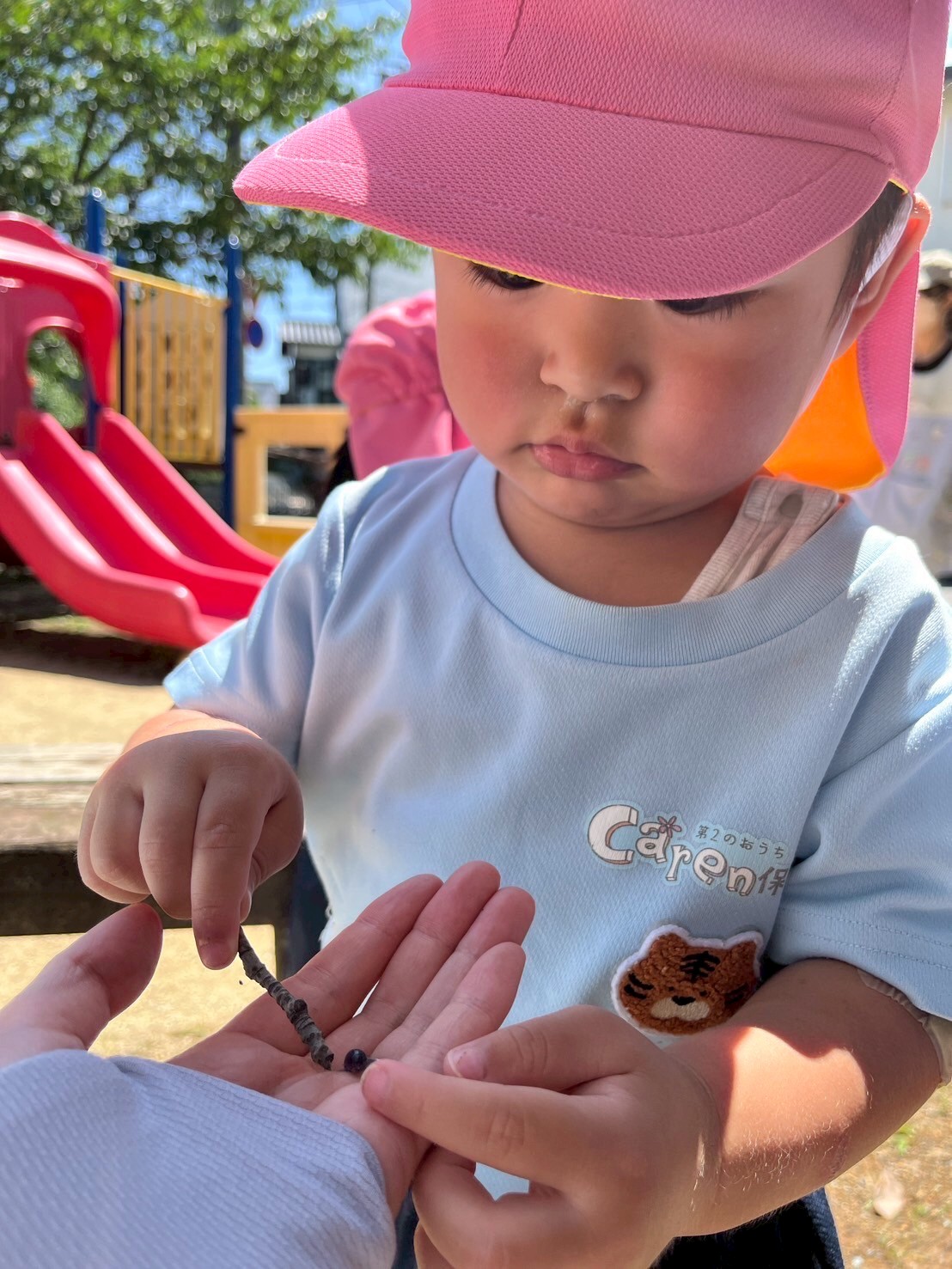 公園では滑り台を何度も滑ったり、木陰でアリやダンゴムを見つけて、観察したり…。