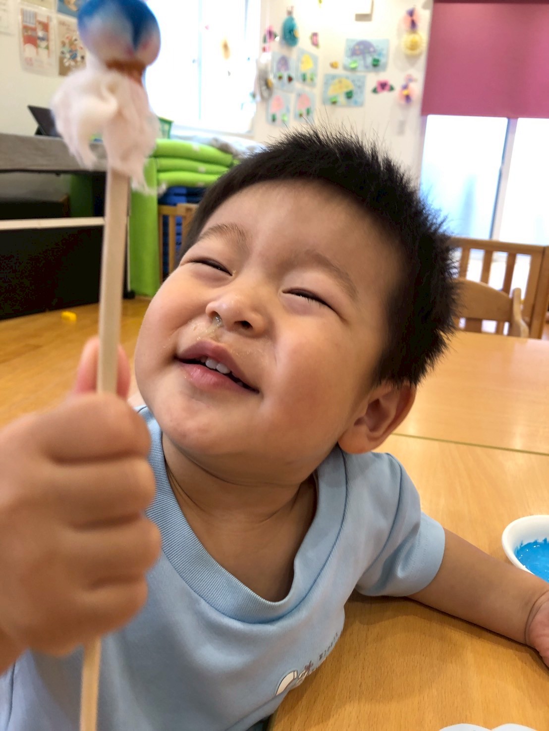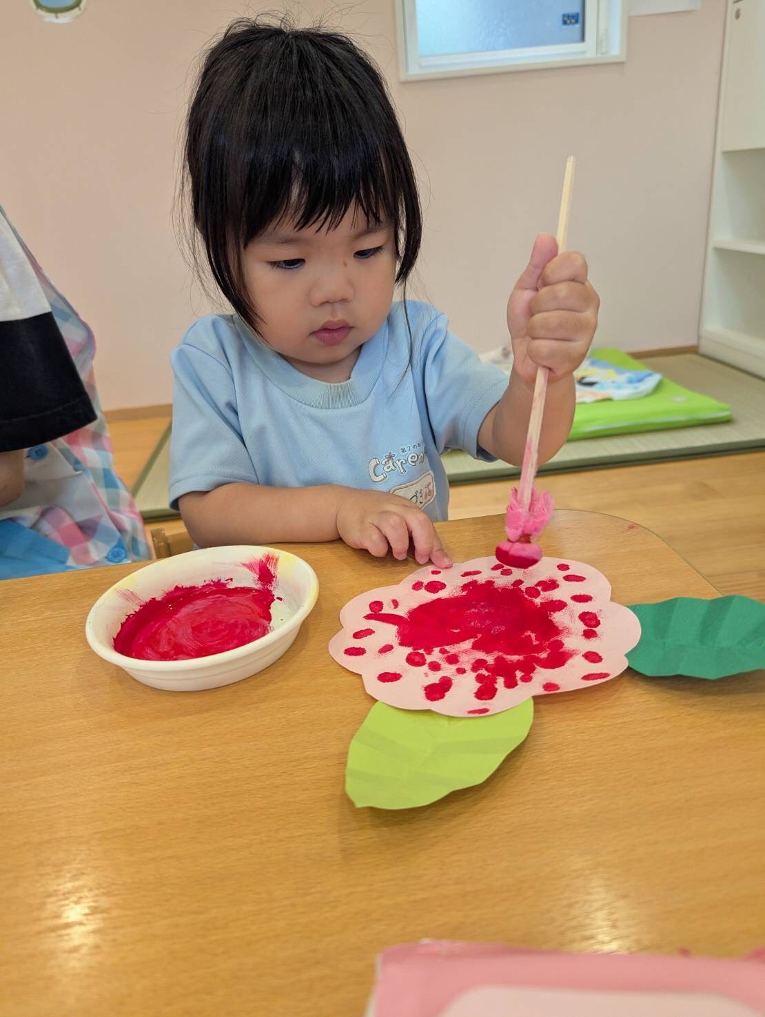 絵の具あそびでは、ポンポンポンとタンポを押して紫陽花を作りましたよ💕