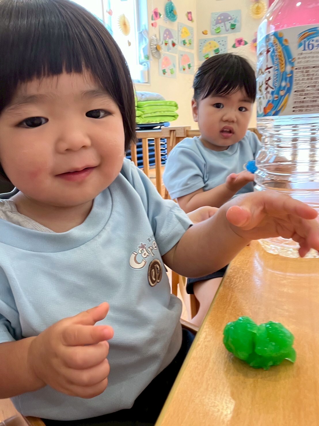 今日は朝のお名前呼びをしたあと、2色のひんやり冷たいスライムが登場✨