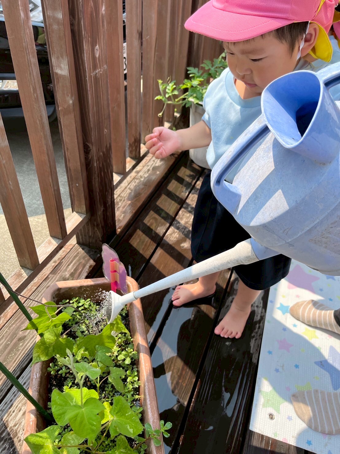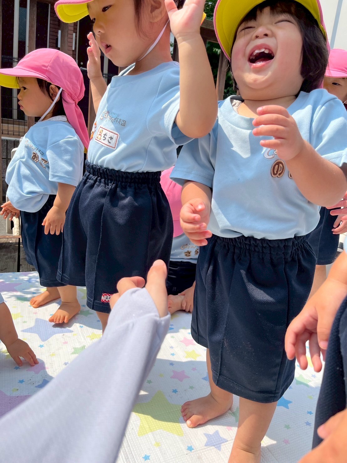 2色のスライムをしばらくぷにぷににぎったり指でつついたりしていました😊そのあとはテラスにでて、ウォーターミストを浴びながら、、、