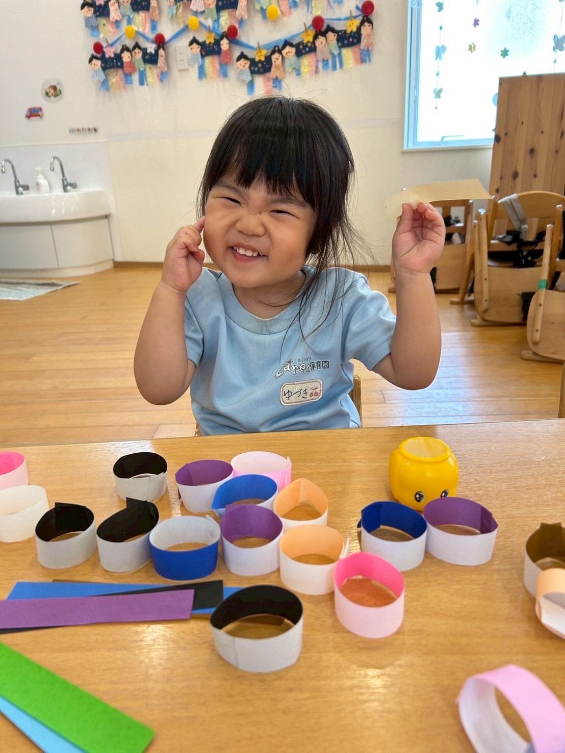 みんな、上手に表現していましたよ✨レッスンのあとは、ぱんだ組さんは七夕の笹に飾る輪繋ぎを作りました。