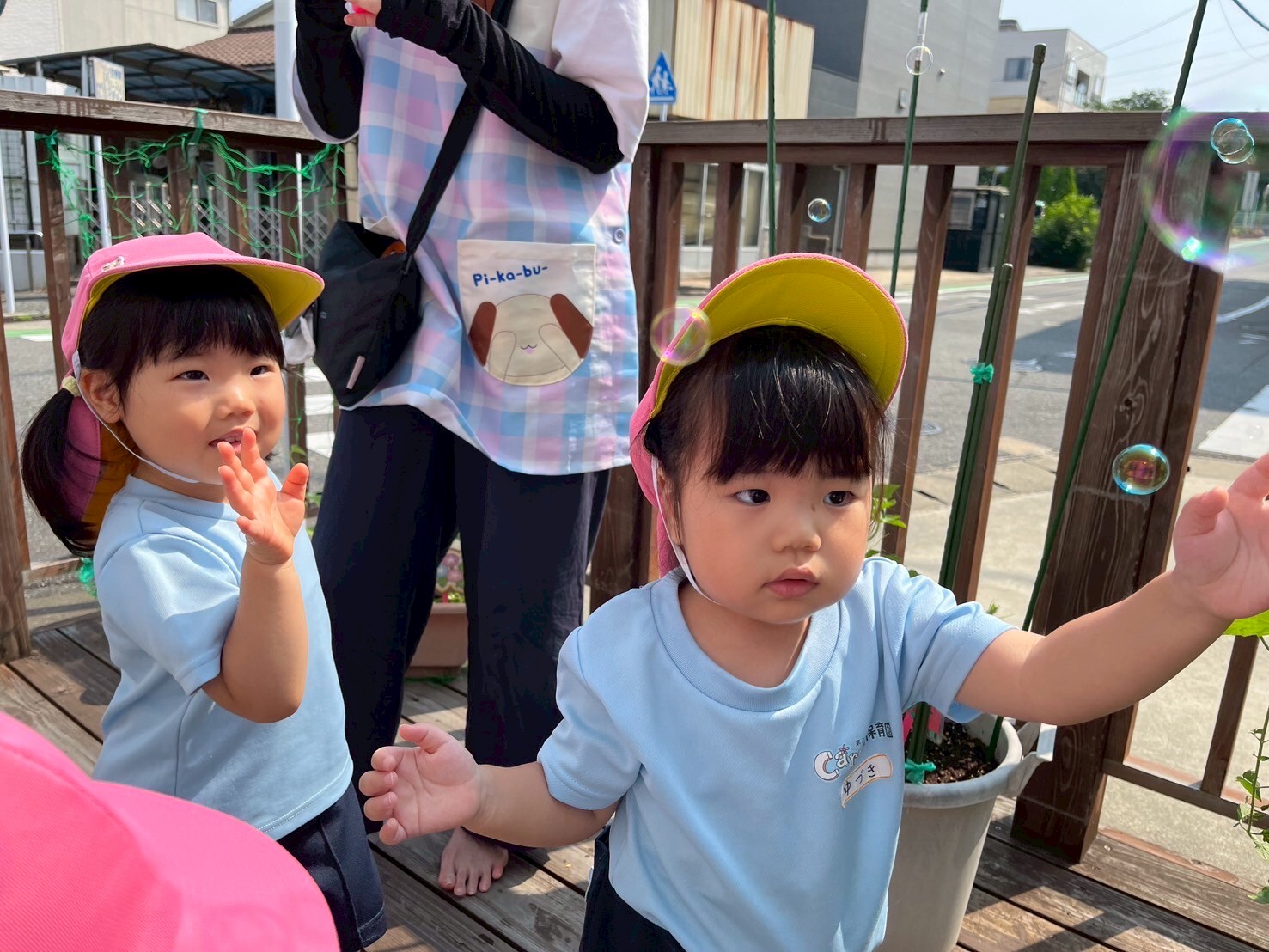 シャボン玉が飛んでくると、「わ〜💕」と歓声を上げていた子どもたち😊