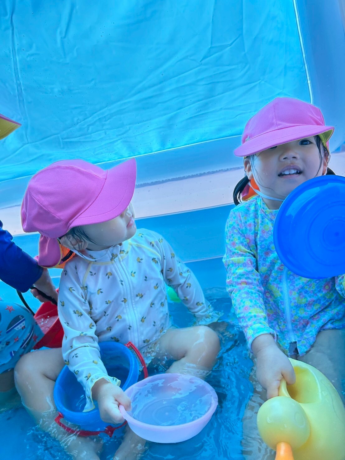 水の涼しい音と園児さんたちの笑顔が、夏の暑さの日々に、とっても癒しとなっている、、先生たちです💕