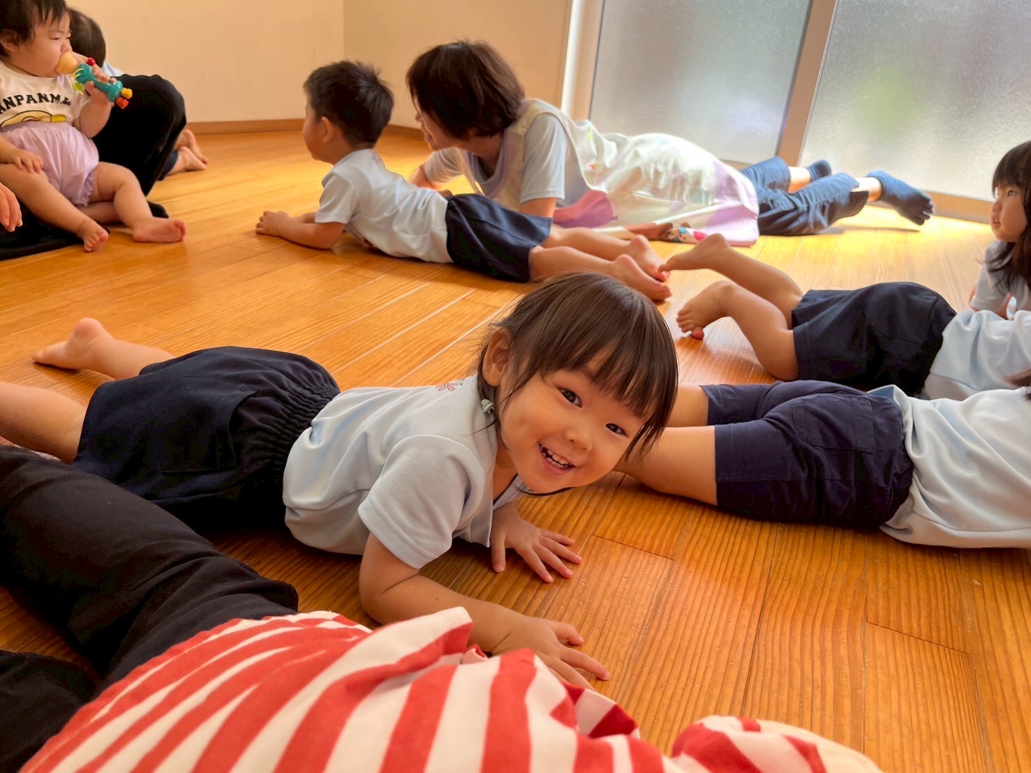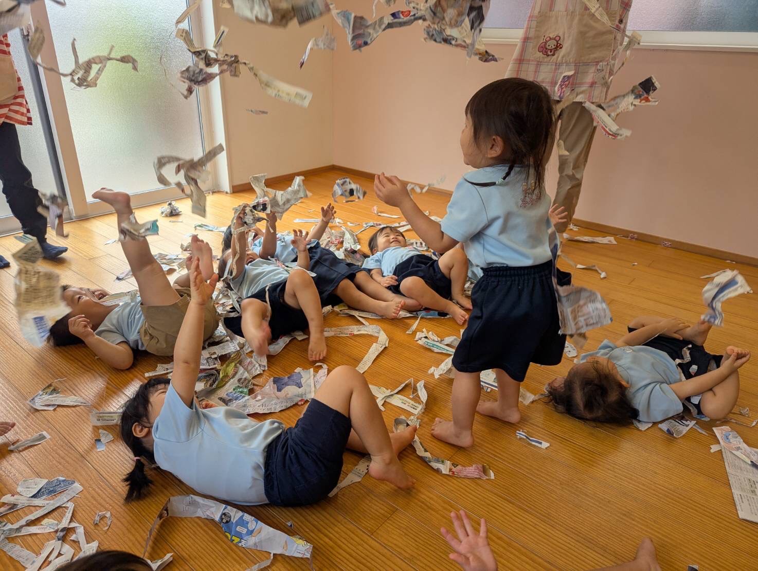 外を覗きながら蝉の鳴き声を聞き、夏を感じましたよ💙その後はみんなが大好きな新聞紙遊び❣️