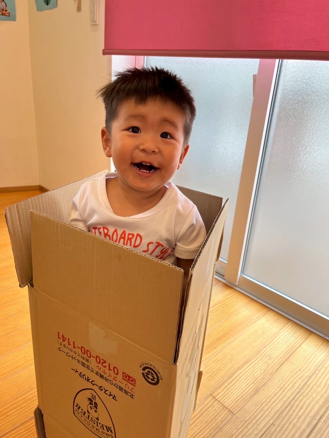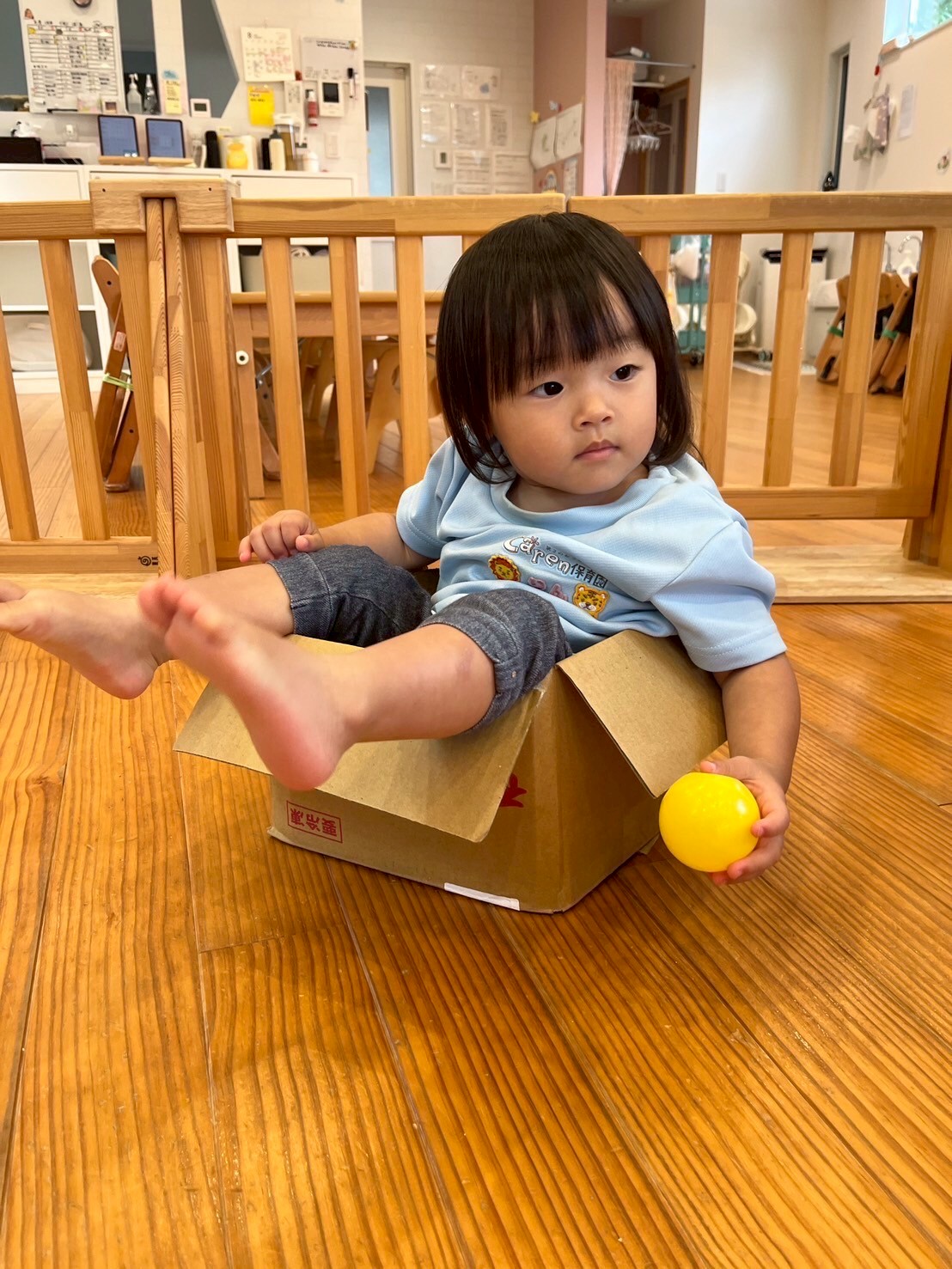段ボールにカラーボールを入れて、自分だけのボールプールを作って楽しんでいました😆💕